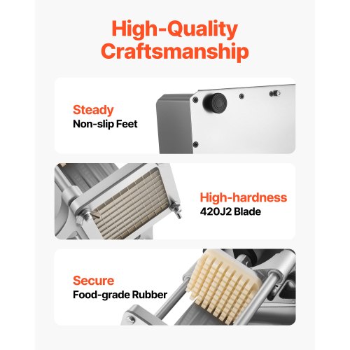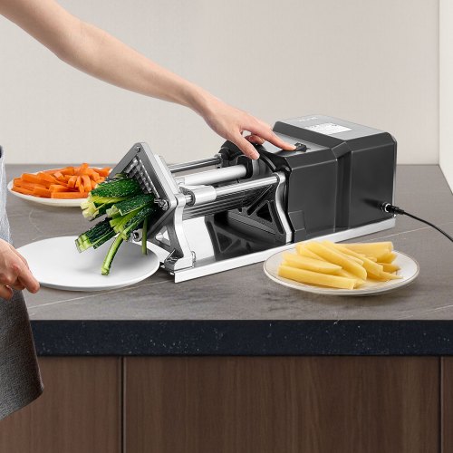 Electric French Fry Cutter Stainless Steel Vegetable Chopper with 3 Blades<br/>Electric Button<br/>Blade Plate<br/>Steady Feet<br/>Durable Blades<br/>Easy to Clean<br/>Wide Application<br/>Blade Material: 420J2,Blade Shape: Grid,Cutting Size: 1/2 inch + 3/8 inch + 1/4 inch,Food Tray Material: SUS304,Product Type: Commercial & Electric,Voltage: AC100-240V 50/60Hz,Food Tray Dimensions: 4.13 x 3.39 x 3.39 inch / 105 x 86 x 86 mm,Item Model Number: QTJ-J002DC,Product Dimensions: 18.90 x 8.07 x 6.50 inch / 480 x 205 x 165 mm,Cycle Time: 15 minutes,Net Weight: 12.08 lbs / 5.48 kg,Power: 40W
