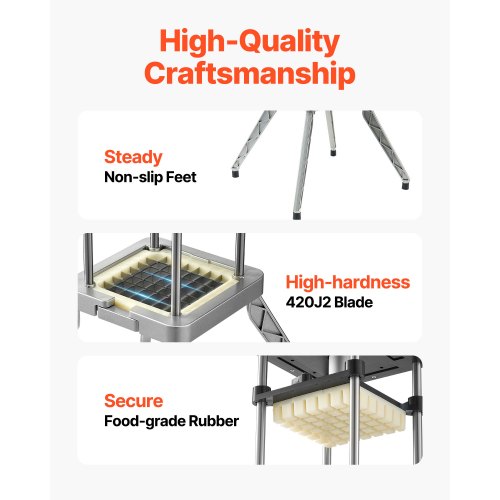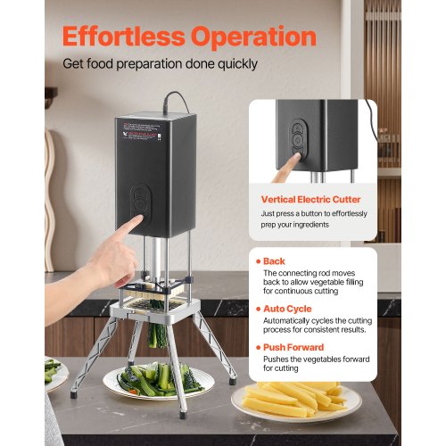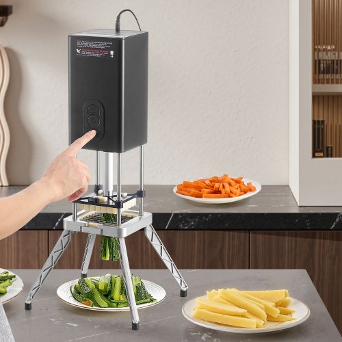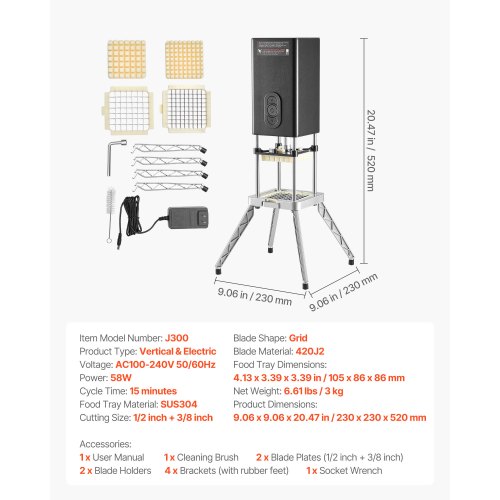 Electric French Fry Cutter Stainless Steel Vegetable Chopper with 2 Blades<br/>Electric Button<br/>Blade Plate<br/>Steady Feet<br/>Durable Blades<br/>Easy to Clean<br/>Wide Application<br/>Blade Material: 420J2,Blade Shape: Grid,Cutting Size: 1/2 inch + 3/8 inch,Food Tray Material: SUS304,Product Type: Vertical & Electric,Voltage: AC100-240V 50/60Hz,Food Tray Dimensions: 4.13 x 3.39 x 3.39 inch / 105 x 86 x 86 mm,Item Model Number: J300,Product Dimensions: 9.06 x 9.06 x 20.47 inch / 230 x 230 x 520 mm,Cycle Time: 15 minutes,Net Weight: 6.61 lbs / 3 kg,Power: 58W