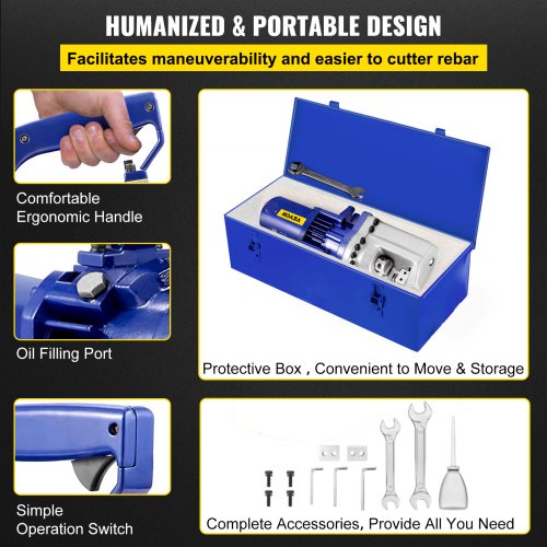 VEVOR Electric Rebar Cutter, 1.7KW 110V Electric Hydraulic Rebar Cutter with Adjustable Alloy Steel Blade Cut 1inch 25mm Rebar within 5 sec3 - 5.5S Cutting SpeedHigh Strength Blade1700W Powerful MotorHumanized Handle & SwitchEasy to StorageWide Range of ApplicationsMin. Rebar Diameter: 3/20" / 4 mm #3,Storage Box Size(L x W x H): 22.24 x 9.06 x 9.65'' / 565 x 230 x 245 mm,Gross Weight: 70 lbs / 31.75 kg,Applications: Construction, Rescue,Max. Rebar Diameter: 1" / 25 mm #8 Grade 60,Cutting Speed: 3-5.5 Seconds,Certification: CE, RoHS,Machine Size(L x W x H): 18.9 x 5.91 x 10.04'' / 480 x 150 x 255 mm,Rebar Cutter Method: Hydraulic Driven Squeeze,Voltage: AC 110V,Hydraulic Oil Type: 46#,Model: RC-25,Frequency: 60Hz,Net Weight: 54 lbs / 24.49,Power: 1700W