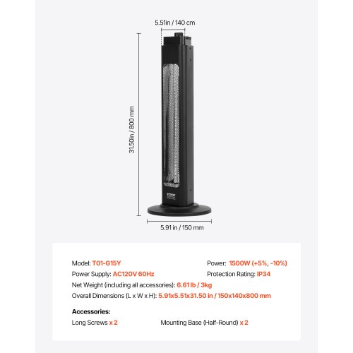 1500W Infrared Heater Electric Space Heater Remote Control 3 Speeds Tower<br/>Quiet Operation<br/>Multiple Protections<br/>Timer with Auto Shut-Off<br/>Space-Saving Tower Design<br/>Versatile Application<br/>Easy Storage<br/>Protection Rating: IP34,Overall Dimensions (L x W x H): 5.91x5.51x31.50 in / 150x140x800 mm,Color: Black,Item Model Number: T01-G15Y,Net Weight (With All Accessories): 6.61 lb / 3kg,Power: 1500W,Main Material: Cold Rolled Steel Plate,Power Supply: AC120V 60Hz