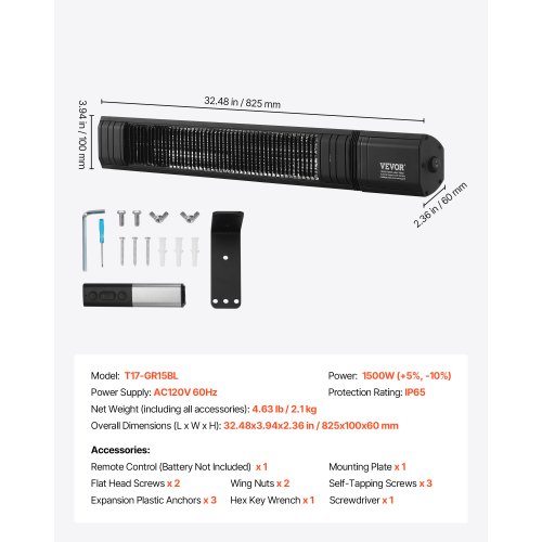 1500W Infrared Heater Electric Space Heater Remote Control 9 Speeds Timer<br/>Quiet Operation<br/>Comprehensive Protection<br/>Timer with Auto Shut-Off<br/>Space-Saving Wall-Mounted Design<br/>Versatile Application<br/>Wall-Mounted Design<br/>Protection Rating: IP65,Overall Dimensions (L x W x H): 32.48x3.94x2.36 in / 825x100x60 mm,Color: Black,Item Model Number: T17-GR15BL,Net Weight (With All Accessories): 4.63 lb / 2.1 kg,Power: 1500W,Main Material: Aluminum Alloy,Power Supply: AC120V 60Hz
