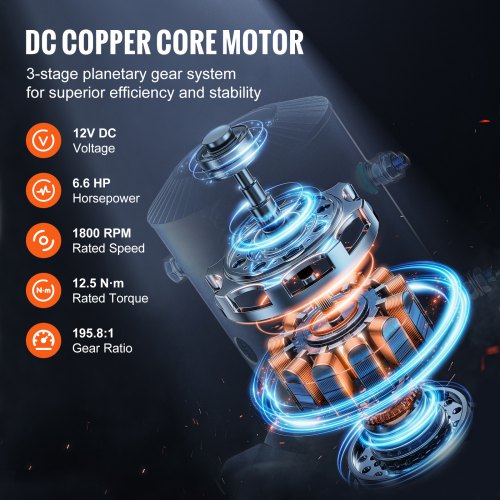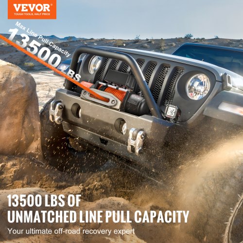 VEVOR Electric Winch Truck 13,500 lb Synthetic Rope Waterproof Remote ControlTruck Electric WinchPowerful Drive SystemSecure & Dependable PullingDurable RopeColor-Coded Power CablesVersatile UseWaterproof Rating: IP55,Remote Control: Wireless + Wired Remote Control,Rope Material: Polyethylene, 12 Strands,Item Model Number: SC13000,Voltage/Horsepower: 12V DC/6.6 HP,Gear Ratio: 195.8:1,Item Dimensions: 21.1 x 6.3 x 8.6 in/53.7 x 16 x 21.8 cm,Rated Line Pull Capacity: 13500 lbs/6123 kg,Rope Specifications: Φ3/8 in x 80 ft/Φ1.0 x 2438.4 cm,Net Weight: 50.4 lbs/22.84 kg,Main Material: Alloy Aluminum, Steel, Copper, Plastic (PPS and PA, etc.),Wireless Remote Control Distance: 65.61 ft/20 m