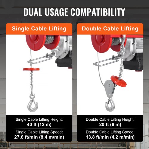 VEVOR Electric Hoist Crane Winch 1320 lbs 328 ft Wireless & 14 ft Wired RemoteStable and EfficientSingle & Double-Cable LiftingDual Control ModesAnti-Tipping DesignPerfect for Every SpaceEasy InstallationControl Mode: Wireless + Wired Dual Control,Double Cable Lifting Height: 20 ft/6 m,Single/Double Cable Hook: Yes,Item Model Number: PA600,Single Cable Lifting Speed: 27.6 ft/min (8.4 m/min),Double Cable Lifting Speed: 13.8 ft/min (4.2 m/min),Product Weight: 36.16 lbs/16.4 kg,Single Cable Lifting Load Capacity: 660 lbs/300 kg,Double Cable Lifting Load Capacity: 1320 lbs/600 kg,Single Cable Lifting Height: 40 ft/12 m,Product Size: 15.35 x 5.51 x 9.45 in/390 x 140 x 240 mm
