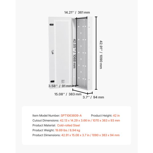 Structured Media Center Enclosure 42 in with Vented Hinged Door Cable ManagementCreate a Clean SpaceEasy to Modify and ExpandConvenient Power ConnectionsWithstand Different EnvironmentsEffective ConcealmentFlexible DesignCutout Dimensions: 42.13 x 14.29 x 3.66 in / 1070 x 363 x 93 mm,Product Material: Cold-rolled Steel,Product Height: 42 in,Item Model Number: SPT1063609-A,Product Weight: 19.69 lbs / 8.94 kg,Product Dimensions: 42.91 x 15.08 x 3.7 in / 1090 x 383 x 94 mm