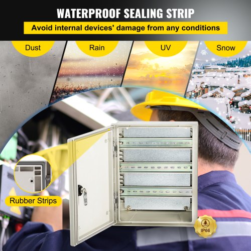 VEVOR Fiberglass STELL Enclosure, 12 x 10 x 6'' NEMA 4X Fiberglass Electrical Box, IP66 Waterproof & Dustproof, Outdoor/Indoor Electrical Junction Box, with Mounting Plate(30 x 25 x 14 cm)Fiberglass Reinforced PolyesterIP66 Protection LevelHinge and Lock SecurityEffortless InstallationThoughtful DesignExtensive ApplicationOuter Dimensions(H x W x D): 11.8 x 9.8 x 5.5"/30 x 25 x 14 cm,Inner Dimensions(H x W x D): 10.8 x 9.4 x 5.5"/27.5 x 24 x 14 cm,Mounting Plate: Galvanized Back Plate,IP Rating: IP66,Material: SMC,Mounting Type: Wall-Mount,Net Weight: 7.72 lbs/3.5 kg,Application: Indoor/Outdoor,NEMA Rating: NEMA Type 3, 3X