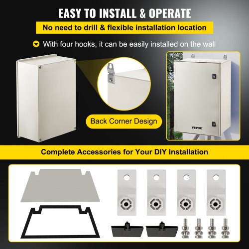 VEVOR NEMA Steel Enclosure, 24 x 16 x 9'' NEMA 4X Fiberglass Electrical Box, IP66 Waterproof & Dustproof, Outdoor/Indoor Electrical Junction Box, with Mounting Plate(60 x 40 x 23 cm)Fiberglass Reinforced PolyesterIP66 Protection LevelHinge and Lock SecurityEffortless InstallationThoughtful DesignExtensive ApplicationOuter Dimensions(H x W x D): 23.6 x 15.7 x 9.1"/60 x 40 x 23 cm,Inner Dimensions(H x W x D): 22.6 x 15.6 x 8.7"/57.5 x 39.5 x 22 cm,Mounting Plate: Galvanized Back Plate,IP Rating: IP66,Material: SMC,Mounting Type: Wall-Mount,Net Weight: 22.71 lbs/10.3 kg,Application: Indoor/Outdoor,NEMA Rating: NEMA Type 3, 3X