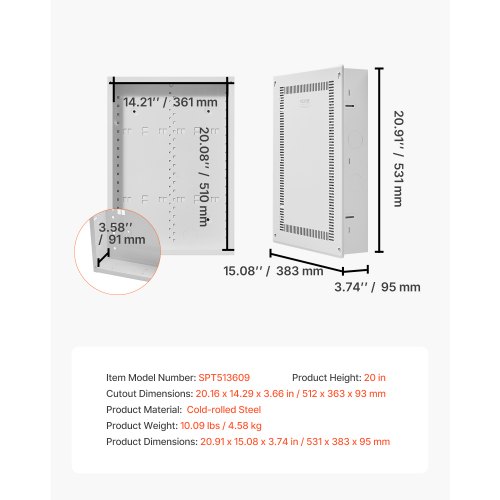 Structured Media Enclosure 20 in Recessed in-Wall TV Media Box with CoverCreate a Clean SpaceEasy to Modify and ExpandConvenient Power ConnectionsWithstand Different EnvironmentsEffective ConcealmentFlexible DesignCutout Dimensions: 20.16 x 14.29 x 3.66 in / 512 x 363 x 93 mm,Product Material: Cold-rolled Steel,Product Height: 20 in,Item Model Number: SPT513609,Product Weight: 10.09 lbs / 4.58 kg,Product Dimensions: 20.91 x 15.08 x 3.74 in / 531 x 383 x 95 mm