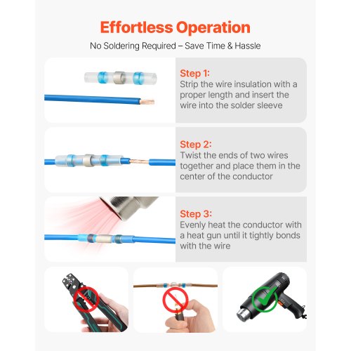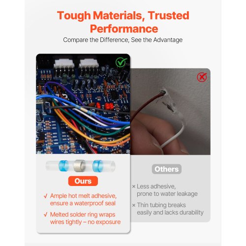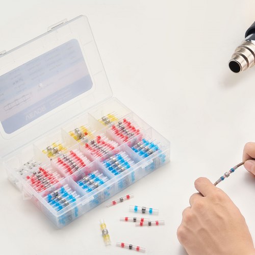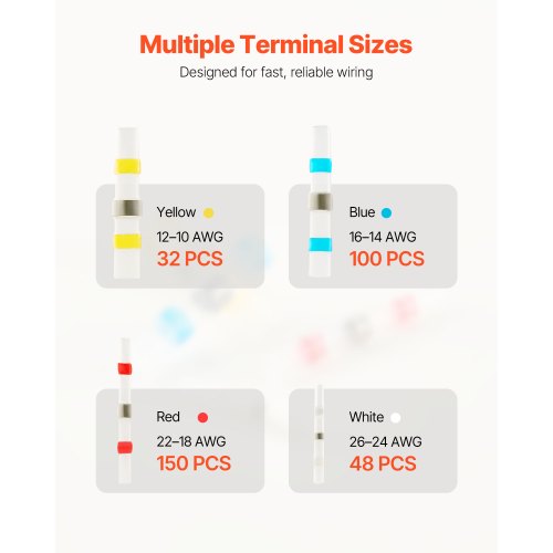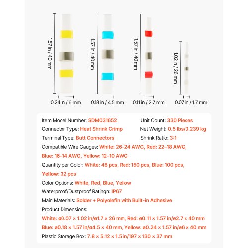 VEVOR 330PCS Heat Shrink Butt Connectors Waterproof Solder Seal Wire Connectors<br/>Ample Quantity<br/>Precise Matching<br/>Quality Materials<br/>Easy to Use<br/>Widely Applicable<br/>High Tension Resistance<br/>Red: 22–18 AWG, 150 pcs,White: 26–24 AWG, 48 pcs,Main Materials: Solder + Polyolefin with Built-in Adhesive,Unit Count: 330 Pieces,Blue: 16–14 AWG, 100 pcs,Yellow: 12–10 AWG, 32 pcs,Waterproof/Dustproof Rating: IP67,Color: White, Red, Blue, Yellow,Item Model Number: SDM031652,Connector Type: Heat Shrink Crimp,Terminal Type: Butt Connectors,Shrink Ratio: 3:1