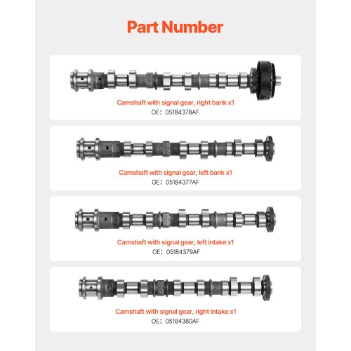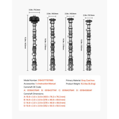4Pcs Engine Camshaft Set 2011-2015 Dodge Durango 2011-2016 Chrysler 300Great Value OptionHigh CompatibilityOne-Stop SolutionWear and Corrosion ProtectionReliable and EfficientInstallation and MaintenancePrimary Material: Gray Cast Iron,Camshaft D Dimensions: 13.9 x 2.0 x 2.0 in (352 x 50.5 x 50.5 mm),Camshaft OE Code: 05184378AF(Camshaft A),05184377AF(Camshaft B),05184379AF(Camshaft C),05184380AF(Camshaft D),Camshaft C Dimensions: 14.9 x 2.0 x 2.0 in (378 x 49.9 x 49.9 mm),Camshaft A Dimensions: 15.9 x 3.0 x 3.0 in (403 x 76.3 x 76.3 mm),Item Model Number: 5184377787980,Product Weight: 15.0 lbs (6.8 kg),Camshaft B Dimensions: 14.9 x 2.0 x 2.0 in (378 x 49.9 x 49.9 mm)