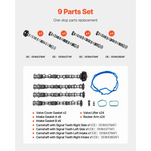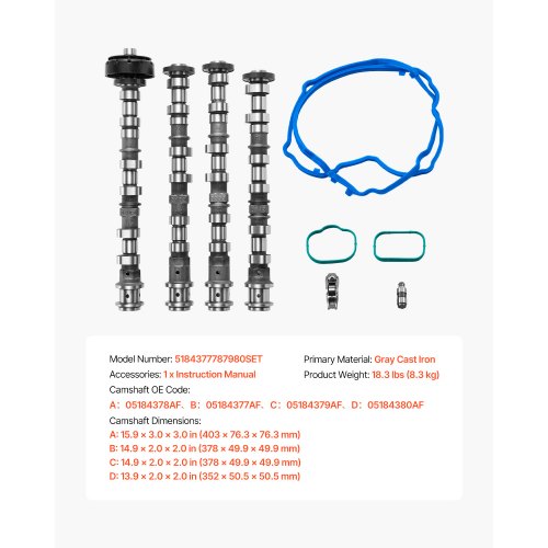 Engine Camshafts Rockers Arm Lifters Kit 2011-2016 Dodge Caravan/JourneyReliable Repair PartnerHighly CompatibleOne-stop SolutionPrecision ManufacturingReliable & EfficientInstallation & MaintenancePrimary Material: Gray Cast Iron,Camshaft D Dimensions: 13.9 x 2.0 x 2.0 in (352 x 50.5 x 50.5 mm),Camshaft OE Code: 05184378AF(Camshaft A),05184377AF(Camshaft B),05184379AF(Camshaft C),05184380AF(Camshaft D),Camshaft C Dimensions: 14.9 x 2.0 x 2.0 in (378 x 49.9 x 49.9 mm),Camshaft A Dimensions: 15.9 x 3.0 x 3.0 in (403 x 76.3 x 76.3 mm),Item Model Number: 5184377787980SET,Product Weight: 18.3 lbs (8.3 kg),Camshaft B Dimensions: 14.9 x 2.0 x 2.0 in (378 x 49.9 x 49.9 mm)