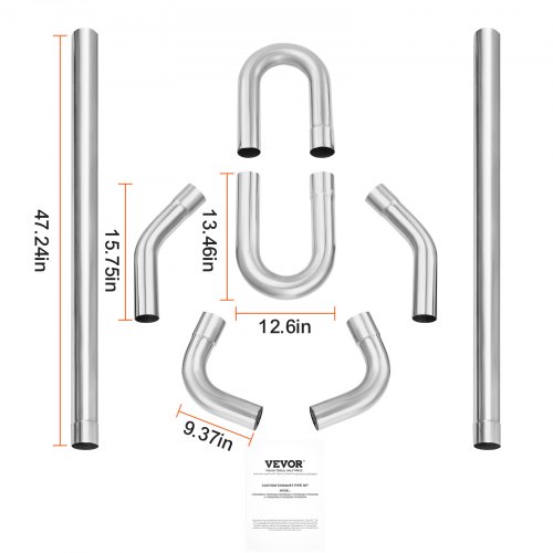 DIY Universal Exhaust Kit 8 Pieces Exhaust Pipe Kit with Slip-Fit JointCustom Exhaust Pipe KitEnhanced Exhaust EfficiencyStainless Steel MaterialEasy to InstallPrimary UseSound CustomizationNumber of Pieces: 8,Color: Galvanized Tube Color,Item Model Number: LT80300GA,U-Tube Size: φ2 x 12.99 in/50.8 x 330 mm,Wall Thickness: 0.06 in/1.5 mm,Material: Galvanized Tube,U-Tube Diameter: 10.04 in/255 mm,Net Weight: 32.5 lbs/14.74 kg,Straight Tube Size: φ3 x 47.24 in/76.2 x 1200 mm,45° Tube Size: φ2 x 15.75 in/50.8 x 400 mm,90° Tube Size: φ2 x 9.14 in/50.8 x 232.25 mm