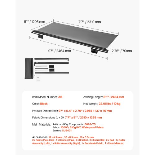 7" to 7' Awning Fabric Replacement Black Slide Topper Awning for RVsSecure and Reliable ShelterCompatible With Small & Medium RVsDurable Four-Layer FabricBuilt For Extreme WeatherLong-Lasting and StrongQuick and Easy InstallationFabric Dimensions (L x D): 7'7" x 51" / 2310 x 1295 mm,Main Materials:,Awning Length: 8'1" / 2464 mm,Screws: SUS401,Color: Black,Item Model Number: A6,Roller and Key Components: 6063-T5,Product Dimensions: 97" x 5.4" x 2.76" / 2464 x 137 x 70 mm,Fabric: 1000D, 510g PVC Waterproof Fabric,Net Weight: 22.05 lbs / 10 kg