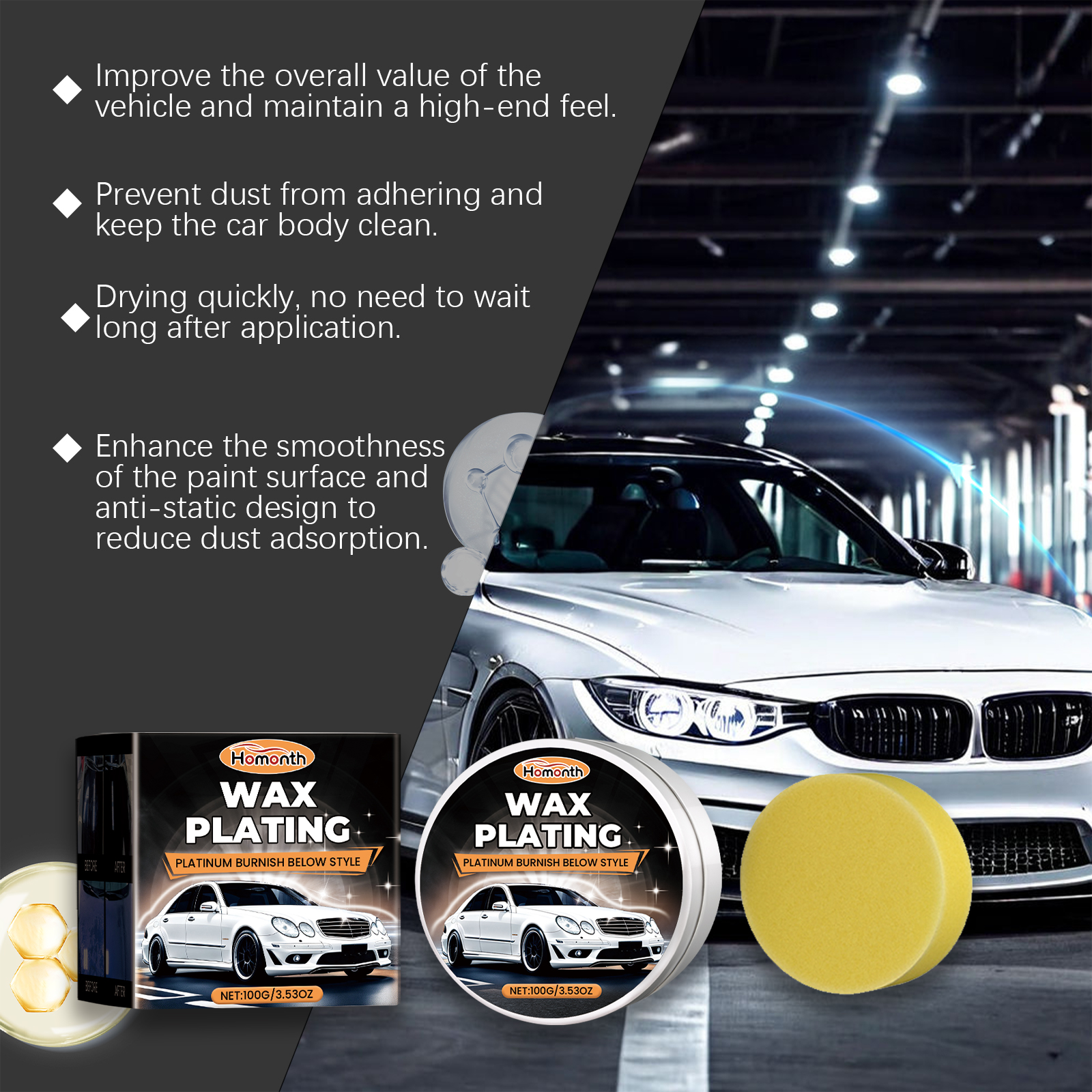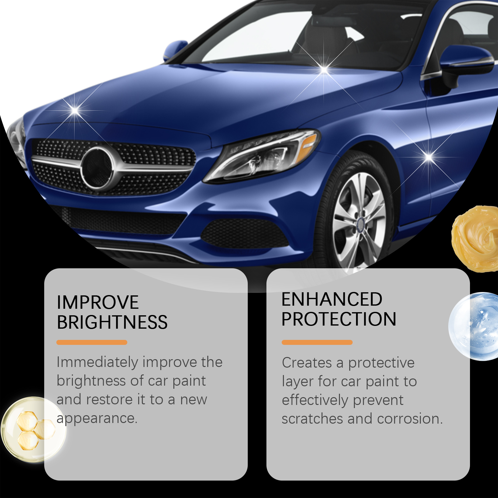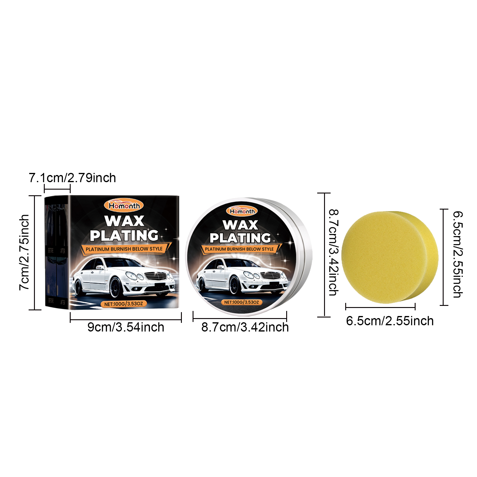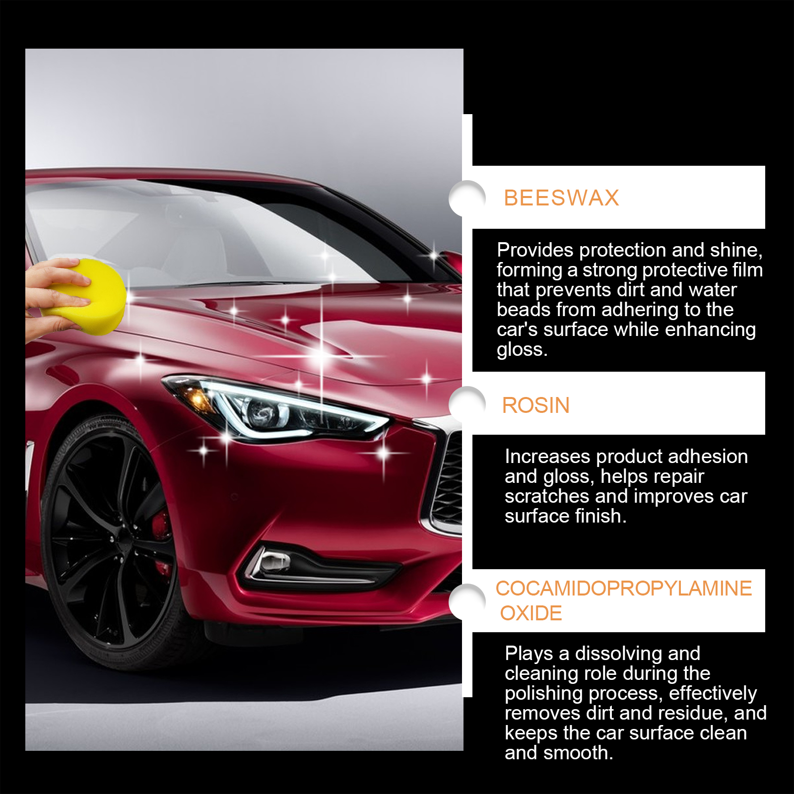 Our car polishing kit contains beeswax and rosin. It can provide protection and shine, forming a strong protective film that prevents dirt and water droplets from adhering to the surface of the car, while increasing damage. The way to use it is simple: wipe the car clean and let the body dry. Use a sponge to apply the product on the car body, wipe evenly until the car paint is glossy. And can effectively repair the scratches on the surface of the car, oxidation and other defects to make the car look new.