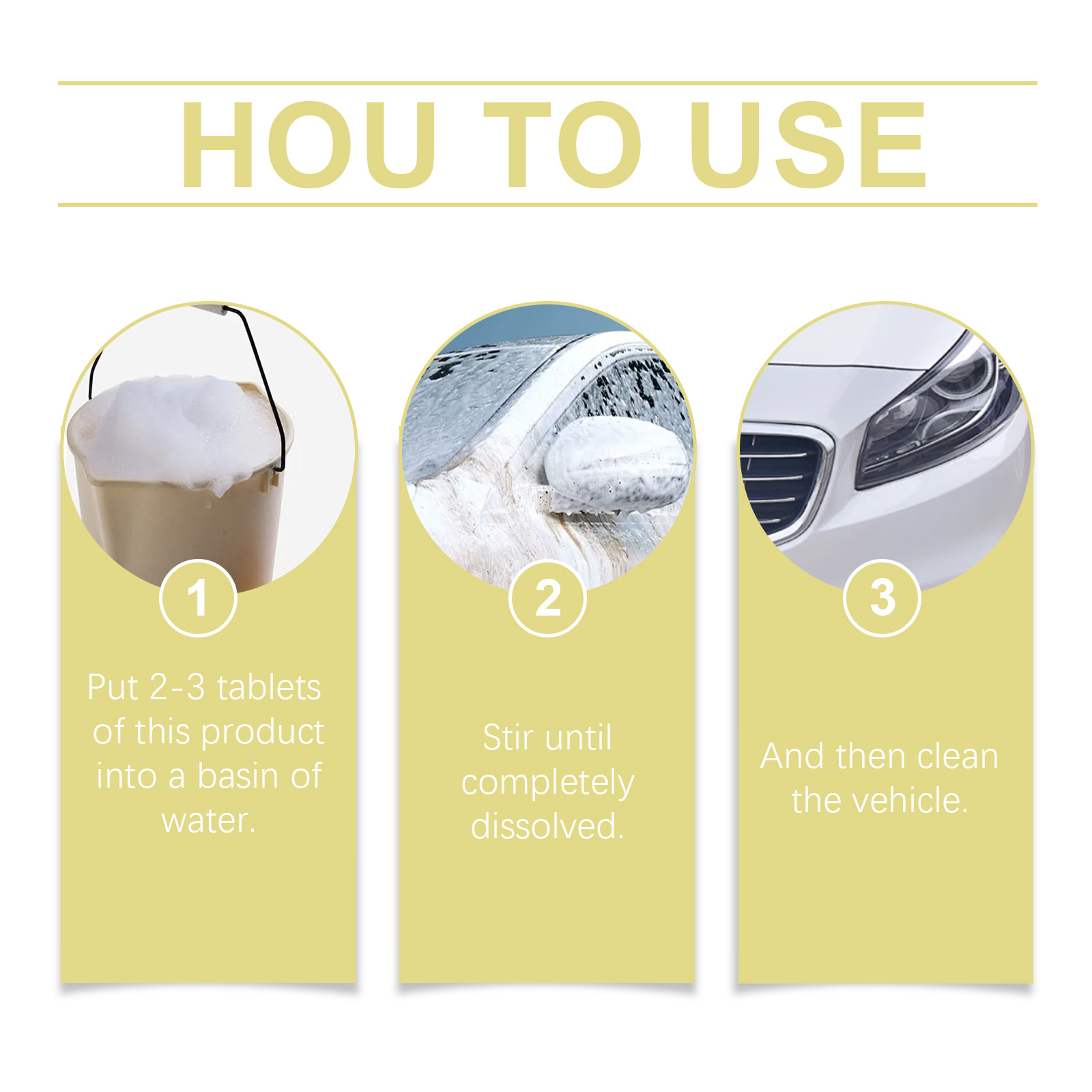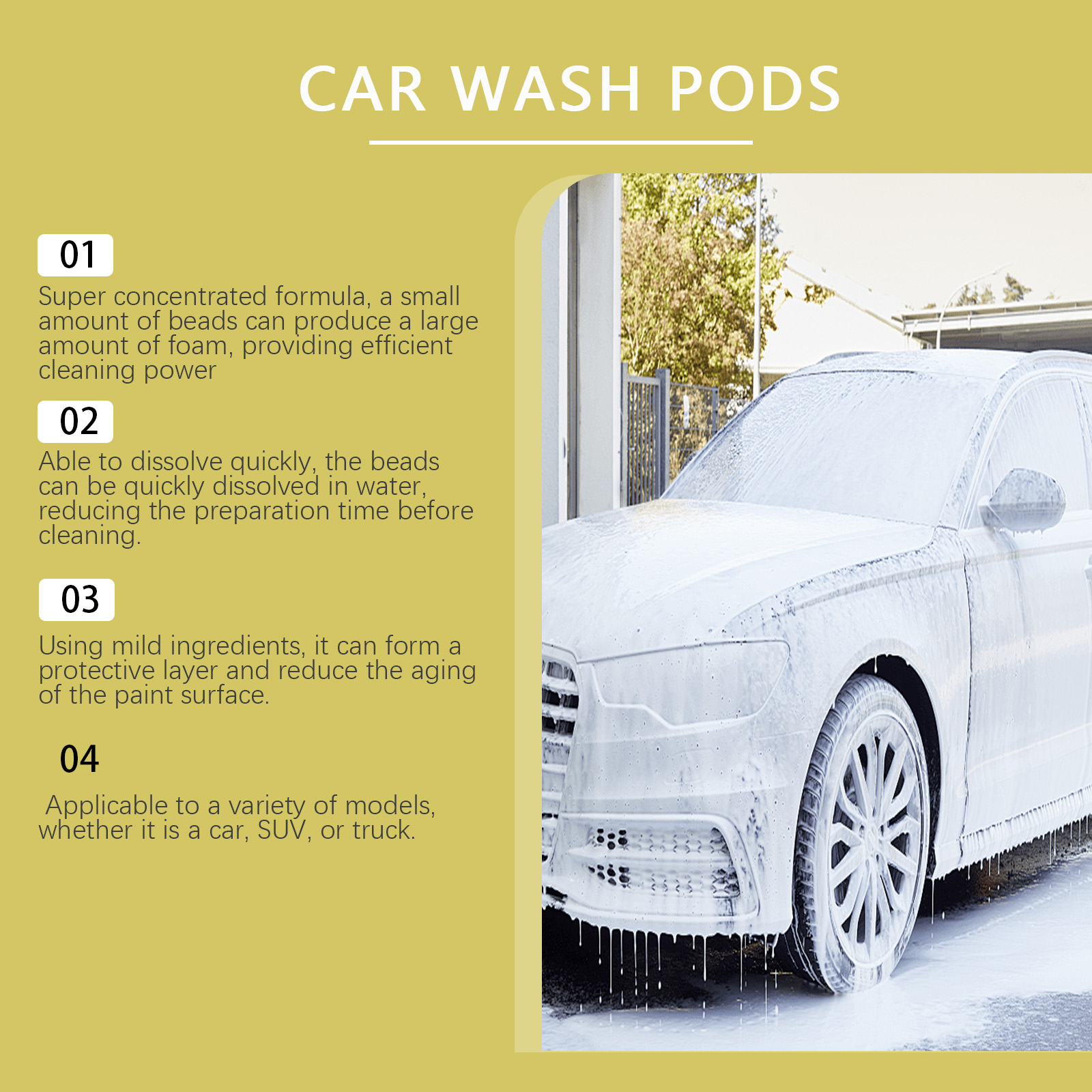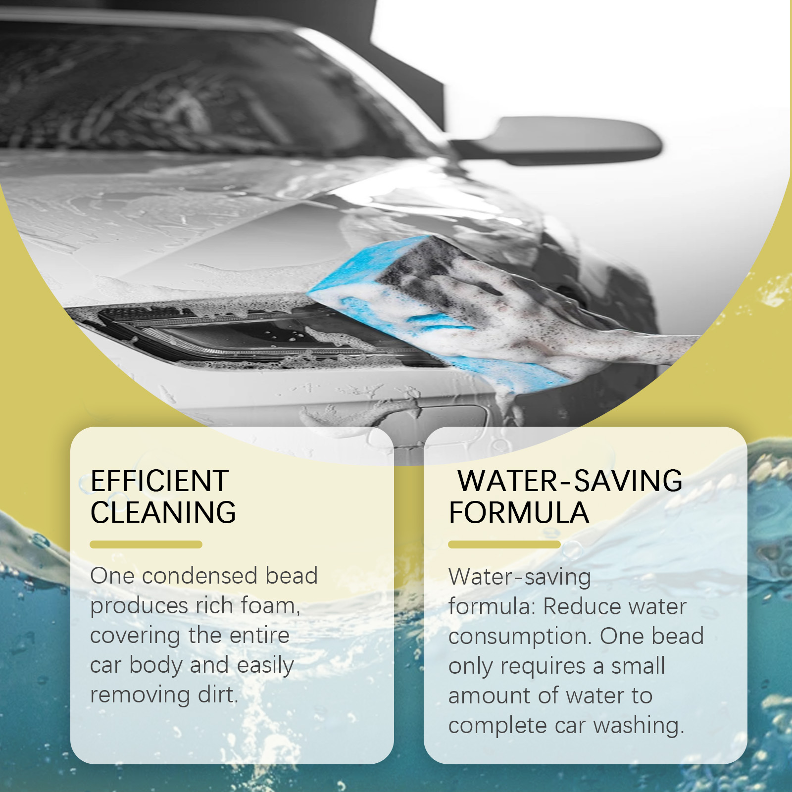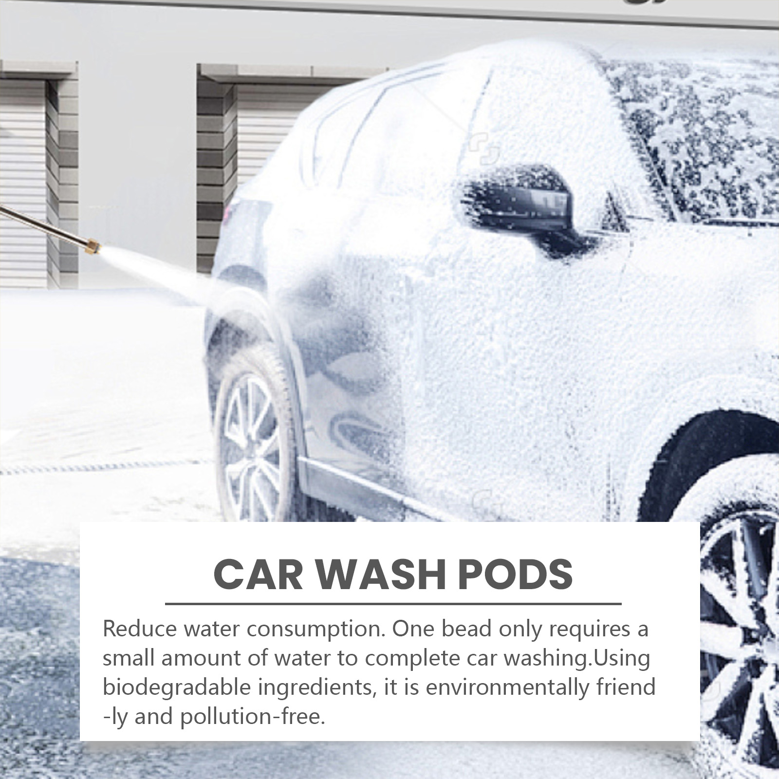 Our concentrated car Wash beads contain disodium EDTA, sodium bicarbonate, lauryl ether 7. It can prevent metal ions from combining with dirt during cleaning and reduce the formation of mineral deposits on the surface to be cleaned. Remove stains and odors without damaging most surfaces. Can effectively remove grease, dirt and other pollutants. Its use method is very simple: 1. Put 2-3 tablets of this product into a basin of water. 2. Stir until completely dissolved. 3. Then wash the vehicle. Concentrated car wash beads reduce water consumption. A head needs only a small amount of water to complete the car wash. Using biodegradable ingredients, environmental protection and pollution-free. The maintenance of the paint, when cleaning, forms a protective layer to reduce scratches and extend the service life of the paint surface. Quickly dissolve, no need to wait, can be used directly. No need for car washes or water cannons. Suitable for all models, no water stains, clean and bright after cleaning.