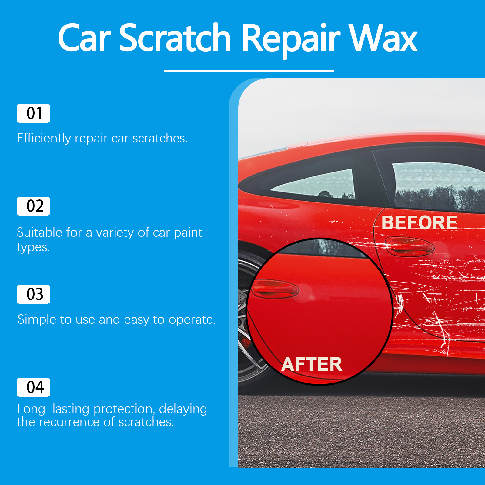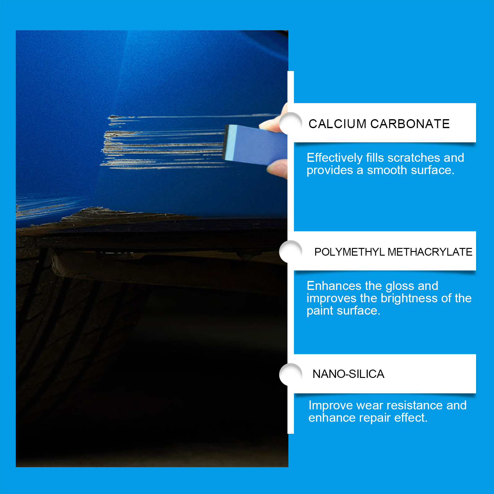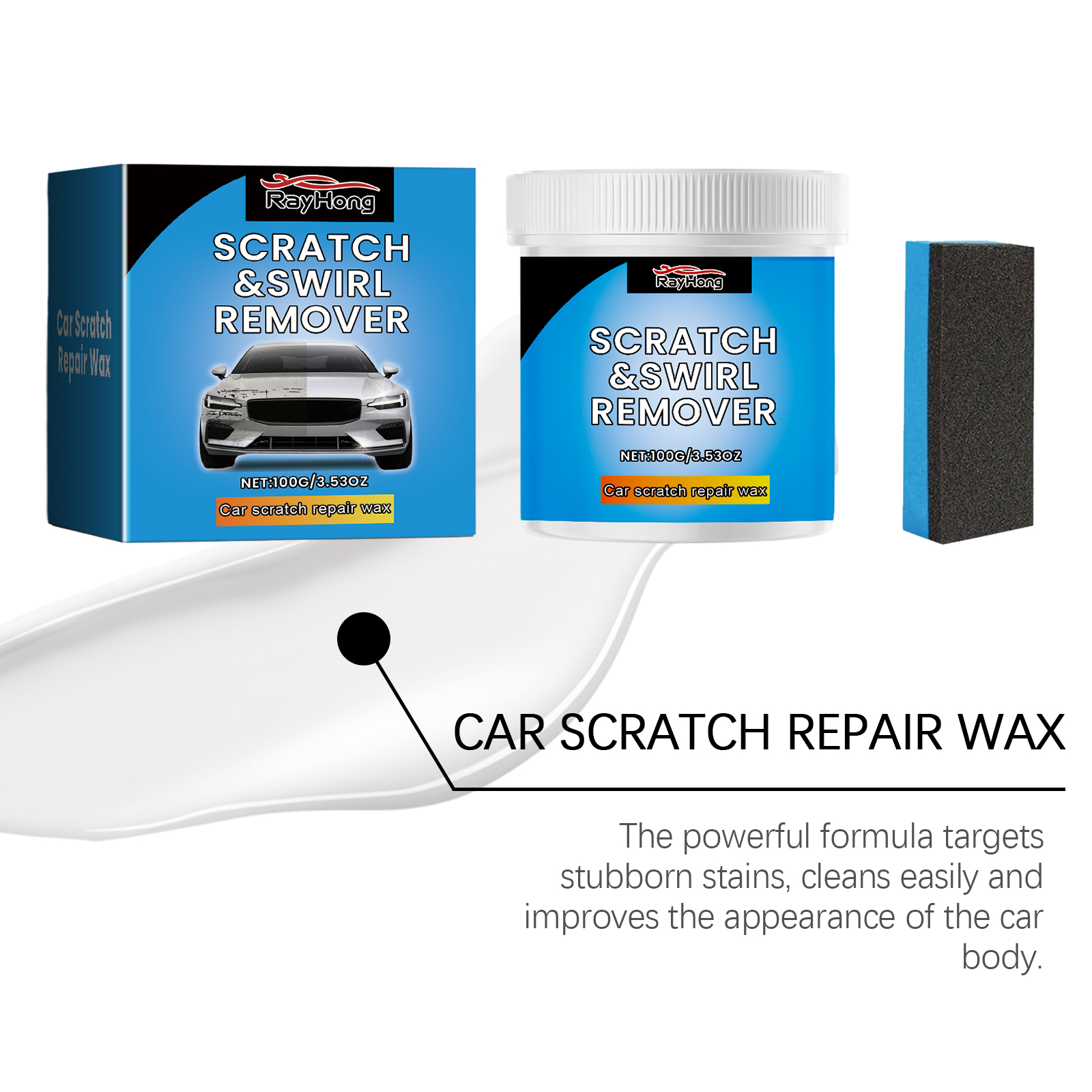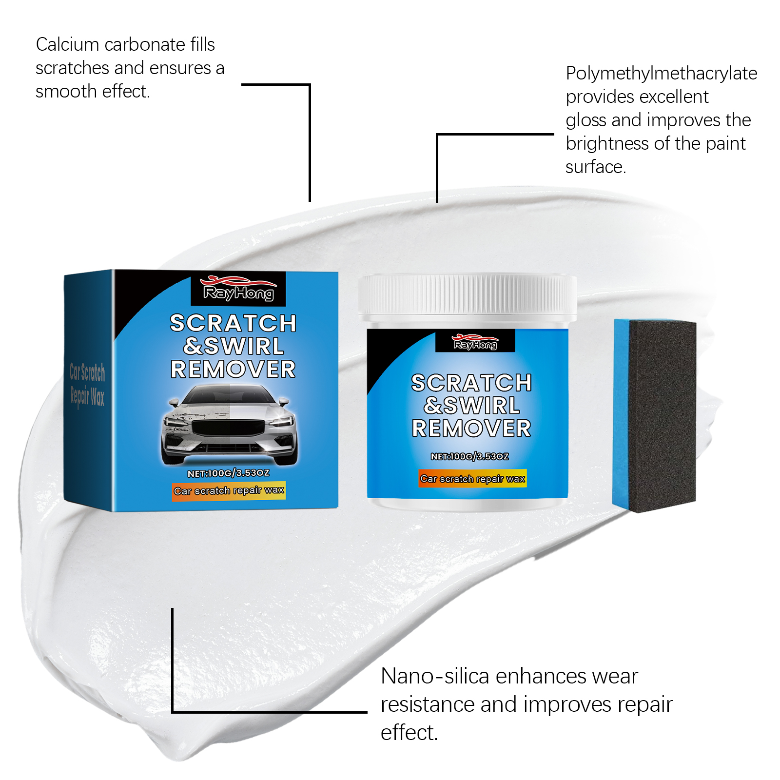 Our car scratch repair cream contains calcium carbonate and glycerin. It can quickly penetrate into the car's finish, effectively removing minor scratches and blemishes and restoring shine. Its use method is very simple: 1. Clean the dust, mud or other impurities in the scratched area of the body. 2. Apply appropriate amount of paste to the scratched surface with a sponge. 3. Gently wipe the scratched area until the scratch gradually disappears. 4. Finally, wipe off the surface residue. Designed for automotive scratches, quick fill and repair finish. Suitable for a variety of car paint types to meet the needs of different models.