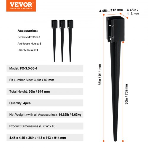 VEVOR Fence Post Anchor Ground Spike, 4 Pack 36 x 4 x 4 Inches Outer Diameter (Inner Diameter 3.5 x3.5 Inches), Metal Black Powder Coated Post Stake Ground, for Mailbox Deck Garden RailingEasy Soil PenetrationSmooth and Burr-freeAll-Inclusive DesignEasy to InstallWide ApplicationsComplete KitModel: FX-3.5-36-4,Fit Lumber Size: 3.5in / 89 mm,Quantity: 4pcs,Product Dimensions (L x W x H): 4.45x4.45x36.02in / 113x113x915 mm,Net Weight (with Accessories): 14.62lb / 6.63kg,Nail Length: 30in / 762mm ±10mm,Material Thickness: Nail Board: 1.7mm, Column Fixing Plate: 1.7mm, ±0.1,Main Material: Steel,Total Height: 36in / 914 mm
