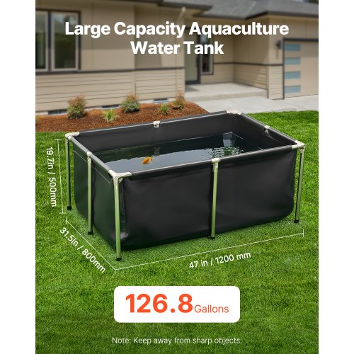 Canvas Fish Pond Above Ground Koi Tank 126.8 Gal Rectangular Pond (Black)Portable Above-Ground Fish PondPowerful SupportEasy CleaningComplete AccessoriesVersatile UseDurable PackagingFrame: Stainless Steel,Capacity: 126.8 gal / 480 L,Item Model Number: DS-204,Product Weight: 20.1 lbs / 9.10 kg,Product Dimensions: 47 x 31.5 x 19.7 in / 1200 x 800 x 500 mm,Main Material: Green PVC Coated Fabric