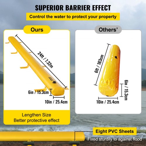 VEVOR Flood Barrier, 24 ft Length x 6 in Height Sandbag Alternative, Water Barrier for Flooding with Great Waterproof Effect, Reusable PVC Water Diversion Tubes, Flood Barriers for Home, Door, GarageExcellent Flood Control8Pcs Fixed MechanismEffortless OperationIndustrial PVC TarpaulinReusable BarrierExtensive UsesWater Capacity: 76.6 Gal / 290 L,Product Size(L x W x H): 24 ft x 10 in x 6 in / 7.32 m x 25.4 cm x 15.3 cm,Model: Flood Barrier 24 ft x 10 in,Weight(Filled): 662 lbs / 300 kg,Material: Industrial PVC,Net Weight: 15.4 lbs / 7 kg