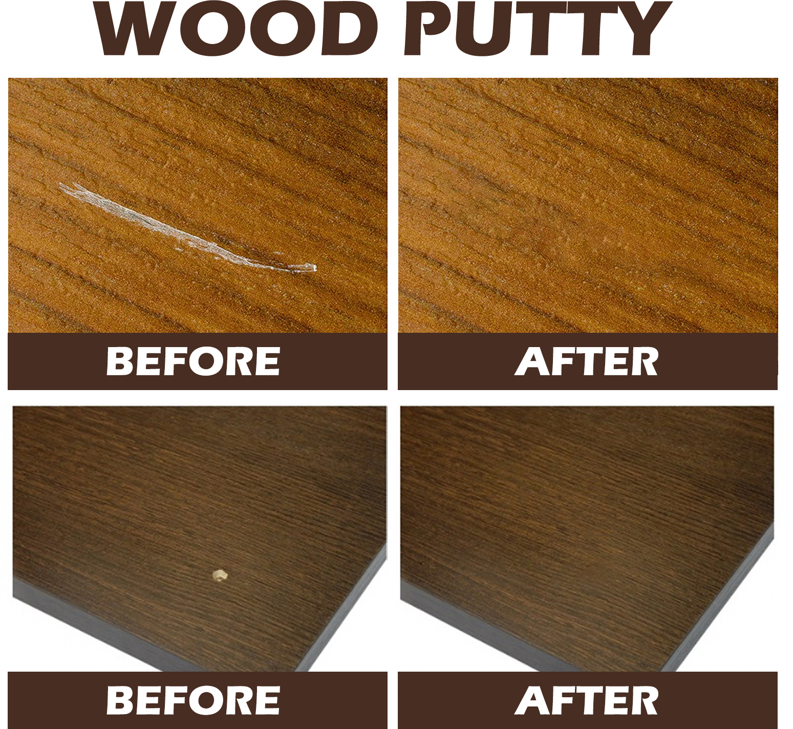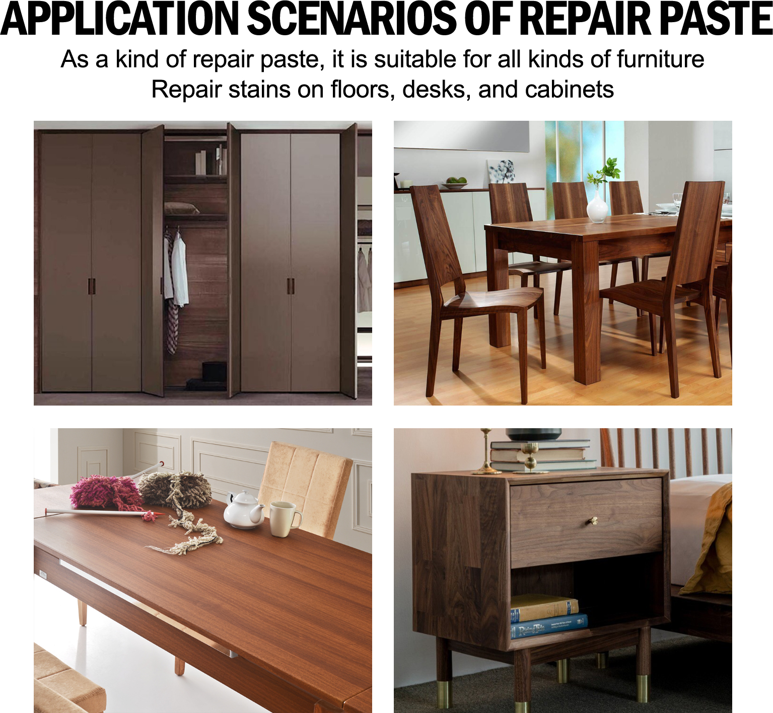 Our wood fillings contain talc, latex and epoxy resins. It instantly fills and covers any scratches, wear and discoloration. Its use method is very simple: 1. Clean the surface, remove excess material 2. Apply an appropriate amount of this product to the desired surface; 4. When dry, rub it back and forth with sandpaper to make it smooth. Wood filler is used as a repair paste for all kinds of furniture to repair stains on floors, tables and cabinets.
