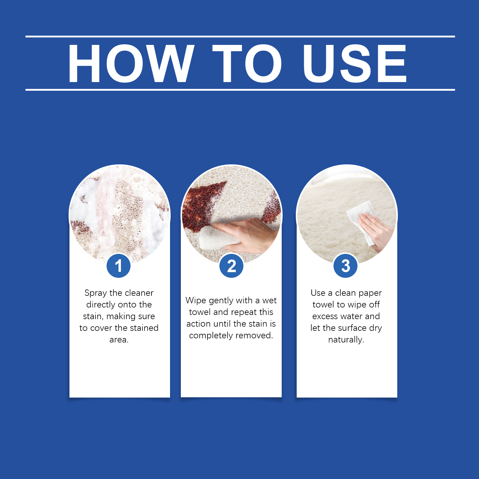 Our carpet foam cleaner contains glycerin and sodium cocamyl glycine. It can effectively remove stains, oil stains and odors on the carpet, and make the carpet look new. Its use method is very simple: 1. Spray the cleaner directly on the stain, making sure to cover the stained area. 2. Gently wipe with a damp towel and repeat until the stain is completely removed. 3. Wipe off excess water with a clean paper towel and allow the surface to dry naturally. The fine foam penetrates deep into the fibers to thoroughly clean dirt and protect the carpet material.