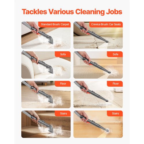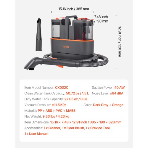 Portable Carpet Cleaner Machine Dual-Water Tank 11.5Kpa Upholstery Cleaner<br/>Portable Carpet Cleaner<br/>Powerful Suction<br/>Multi-Tool Cleaning<br/>Family Essential<br/>Compact & Efficient<br/>Exceptional Leak-Resistance<br/>Noise Level: ≤84 dBA,Clean Water Tank Capacity: 50.72 oz / 1.5 L,Suction Power: 40 AW,Color: Dark Gray + Orange,Item Model Number: CX002C,Dirty Water Tank Capacity: 27.05 oz / 0.8 L,Material: PP + ABS + PVC + MABS,Item Dimensions: 15.16 x 7.48 x 12.91 inch / 385 x 190 x 328 mm,Vacuum Pressure: ≥11.5 KPa,Net Weight: 9.33 lbs / 4.23 kg,Power Supply: AC110V–120V, 60Hz, 450W