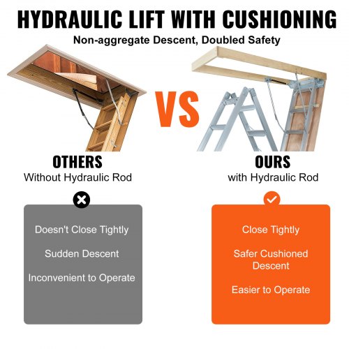 VEVOR Attic Ladder Foldable, 350-pound Capacity, 22.5" x 63", Multi-Purpose Aluminium Extension, Lightweight and Portable, Fits 9.5'-12' Ceiling Heights, Convenient Access to Your Attic StandardEasy InstallationCustomize the Ideal HeightVersatile UsageSturdy AccessoriesHydraulic Cushioned DescentConcealed Door PanelMaximum Load: 350 lbs / 158.8 kg,Primary Materials: Aluminum + Wood,Net Weight (including all accessories): 46.3 lbs / 21 kg,Number of Steps: 12,Step Dimensions: 14" x 2.95" / 355 x 75 mm,Item Model Number: A7,Stainless Steel Ring Length: 1.97" / 50 mm,Stainless Steel Lever Length: 6.6 ft / 2 m