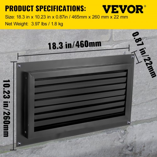 VEVOR Flood Vent, 8" Height x 16" Width Foundation Flood Vent, to Reduce Foundation Damage and Flood Risk, Black, Wall Mounted Flood Vent, for Crawl Spaces,Garages & Full Height EnclosuresReduce Flood RiskDetachable Back PanelEasy & Convenient InstallationRigid Zinc Coated SteelSurface Paint TreatmentDurable Welding CraftOpening Dimensions(W x H): 16 x 8'' / 406.4 x 203.2 mm,Thickness: 0.03'' / 0.75 mm,Plug Profile: Wall,Color: Black,Model: FHTFKSX-16''x8'',Item Dimensions(W x H x D): 18.3 x 10.23 x 0.87'' / 465 x 260 x 22 mm,Material: Zinc Coated Steel,Net Weight: 3.97 lbs / 1.8 kg