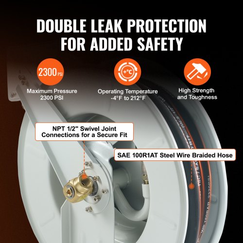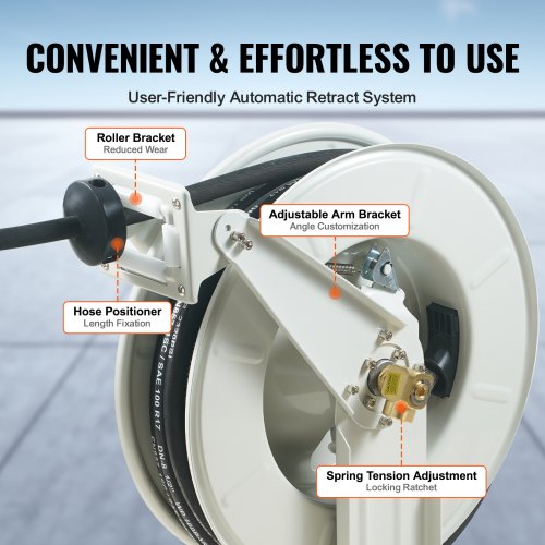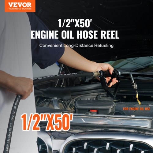 VEVOR Fuel Hose Reel, 1/2" x 50', Extra Long Retractable Machine Oil Hose Reel, Spring Driven Auto Swivel Rewind, Heavy-Duty Carbon Steel Construction with Hose for Auto Repair, Industries, 2300 PSIFuel Up Anywhere, AnytimeIndustrial Strength Right HereSmart Rewind, Smoother WorkflowUniversal Threads for the WinHigh-Strength Carbon SteelReady-to-Go Install SlotsInlet Port Specification: NPT 1/2",Working Temperature: -4℉ to 212℉/ -20℃ to 100℃,Item Model Number: 1224BT-100-1,Product Weight: 46.3 lbs/21.02 kg,Hose Size: 1/2" x 50',Suitable Fuel Types: Machine Oil,Max Working Pressure: 2300 psi,Product Size: 17.7" x 8.27" x 19.7"/450 x 210 x 500 mm