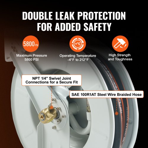 VEVOR Fuel Hose Reel, 1/4" x 50', Extra Long Retractable Grease Hose Reel, Spring Driven Auto Swivel Rewind, Heavy-Duty Carbon Steel Construction with Hose for Auto Repair, Heavy Industries, 5800 PSIFuel Up Anywhere, AnytimeIndustrial Strength Right HereSmart Rewind, Smoother WorkflowUniversal Threads for the WinHigh-Strength Carbon SteelReady-to-Go Install SlotsInlet Port Specification: NPT 1/4",Working Temperature: -4℉ to 212℉/ -20℃ to 100℃,Item Model Number: 1224BT-100,Product Weight: 43.3 lbs/19.64 kg,Hose Size: 1/4" x 50',Suitable Fuel Types: Grease,Max Working Pressure: 5800 psi,Product Size: 17.7" x 8.27" x 19.7"/450 x 210 x 500 mm