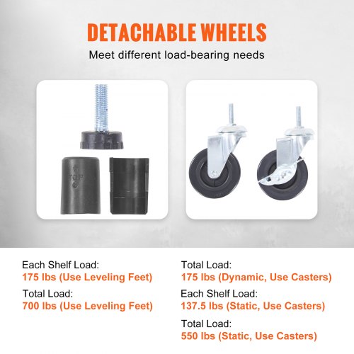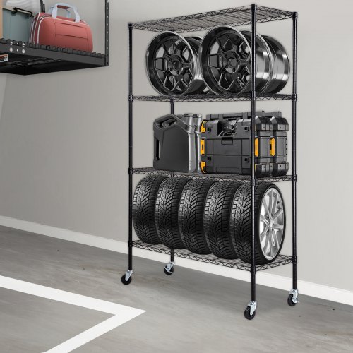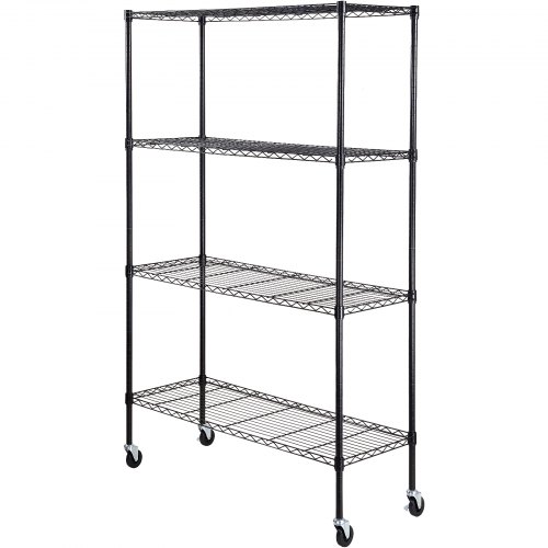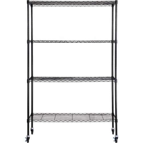 VEVOR Storage Shelving Unit with Wheels, 4-Tier Adjustable, 700 lbs Capacity, Heavy Duty Garage Shelves Metal Organizer Wire Rack, Black, 47.2" L x 17.7" W x 74" H for Kitchen Pantry Basement BathroomStrong Load & Neat StorageSleek and Scratch-Resistant CoatingNo-Fuss AssemblyAdjustable ShelvesOne Unit, Multiple ScenariosSturdy MaterialAdjustable Shelf Spacing: 1"/25 mm (4 Shelves),Product Size (L x W x H): 47.2" x 17.7" x 74"/120 x 45 x 188 cm,Item Model Number: I6V0,Product Weight: 33 lbs/14.95 kg,Material: Q195 Carbon Steel+Powder Spraying,Total Load: 700 lbs (Use Leveling Feet),Each Shelf Load: 175 lbs (Use Leveling Feet)
