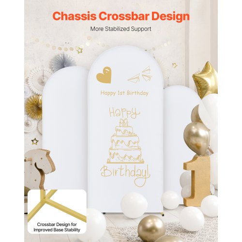 VEVOR Metal Arch Backdrop Stand Set of 3 Stand with Premium Gauze for WeddingSuitable DecorationEasy InstallationSturdy & DurablePersonalized DecorVersatile ApplicationReusable & PortableShape: Dome-Shaped,Product Dimension: 17.5 x 11.6 x 7.5 in/445 x 295 x 190 mm,Number of Pieces: 3,Arch 1: 6 x 2.6 ft/805 x 405 x 1805 mm,Color: Gold,Item Model Number: TFHQGM654FTBJB,Arch 2: 5 x 2.2 ft /675 x 405 x 1500 mm,Arch 3: 4 x 1.7 ft /525 x 405 x 1205 mm,Net Weight: 15.4 lbs/7 kg,With or Without Cloth Cover: With,Product Size: