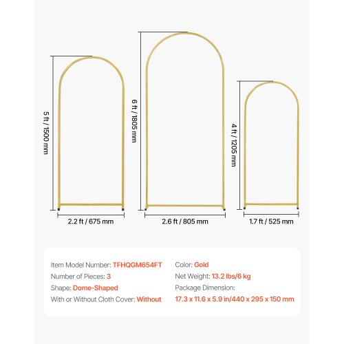 VEVOR Metal Arch Backdrop Stand Set of 3 Stand with Case Connection for WeddingSuitable DecorationEasy InstallationSturdy & DurablePersonalized DecorVersatile ApplicationReusable & PortableShape: Dome-Shaped,Product Dimension: 17.3 x 11.6 x 5.9 in/440 x 295 x 150 mm,Number of Pieces: 3,Arch 1: 6 x 2.6 ft/805 x 405 x 1805 mm,Color: Gold,Item Model Number: TFHQGM654FT,Arch 2: 5 x 2.2 ft /675 x 405 x 1500 mm,Arch 3: 4 x 1.7 ft /525 x 405 x 1205 mm,Net Weight: 13.2 lbs/6 kg,With or Without Cloth Cover: Without,Product Size: