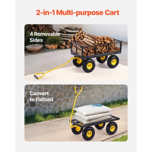 Vevor 500 Lbs Steel Garden Cart, Heavy Duty Pullable Cart with Wheels for Garden, Metal Yard Utility Wagon with 10" All Terrain Tires, Removable Mesh Sides and 180° Rotating HandleMake Gardening and Farming Easier2-in-1 DesignAll-Terrain Rubber TiresErgonomic Adjustable HandleDurable ConstructionComfortable and Adjustable HandleCart Dimensions: 860 x 457 x 240mm / 33.86 x 18.0 x 9.45 inches,Inner Cart Dimensions: 830 x 435 x 205mm / 32.68 x 17.13 x 8.07 inches,Color: Yellow + Black,Item Model Number: V500,Product Weight: 16 kg / 35.27 lbs,Max Load Capacity: 500 lbs / 226.80 kg,Material: Q235 Steel + Rubber,Product Size: 1700 x 480 x 515mm / 66.93 x 18.90 x 20.28 inches