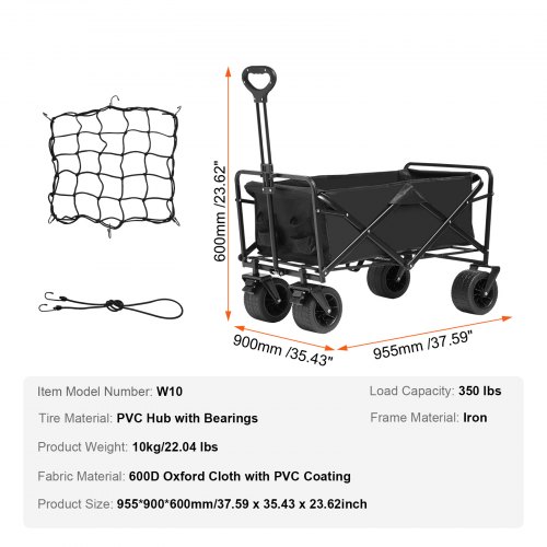 VEVOR Collapsible Folding Wagon, 3 cu.ft Beach Wagon Cart with All-Terrain Wheels, Heavy Duty Folding Wagon Cart 350 lbs Weight Capacity with Drink Holders, Sports Wagon for Camping, Shopping, GardenLarge Storage CapacityAll-Terrain Swivel WheelsAdjustable HandleVersatile ApplicationsQuick FoldingMultifunctional Outdoor WagonLoad Capacity: 350 lbs,Item Model Number: W10,Tire Material: PVC Hub with Bearings,Product Weight: 10 kg/22.04 lbs,Frame Material: Iron,Fabric Material: 600D Oxford Cloth with PVC Coating,Product Size: 955x900x600 mm/37.59x35.43x23.62 inch