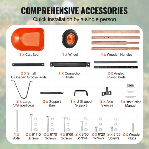 VEVOR Wheelbarrow Cart, 5 Cu. Ft. Load & 265 lbs Capacity, One Wheel Garden Dump Cart, Garden Wagon with Metal Handle & 16" Wide Track Wheels, Easy Loading Utility Yard Cart & Wagons for Lawn FarmGardening HelperEasy to UseDurable ConstructionSimple AssemblyVersatile UseEasy to CleanTire Size: φ16 x 4'',Color: Orange + Black,Maximum Load Capacity: 265 lbs / 120 kg,Product Model: WB-1000,Cart Bed Dimensions: 35.83 x 24.61 x 9.06 in / 91 x 62.5 x 23 cm,Product Dimensions: 55.12 x 24.41 x 22.83 in / 140 x 62 x 58 cm,Net Weight: 28.22 lbs / 12.8 kg,Main Material: Iron + PU (Solid Foam Wheel)