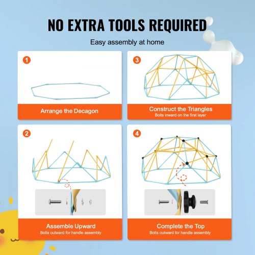VEVOR Climbing Dome, for Kids 3 to 9 Years Old, 8FT Geometric Dome Climber with Slide,Jungle Gym Supports 600LBS and Easy Assembly, with Climbing Grip, Outdoor and Indoor Play Equipment for KidsTwo-in-One Geometric Climbing DomePerfect Kids' GiftEnhanced Safety FeaturesEasy InstallationLong-lasting DurabilitySuperior Load CapacityMaximum Load: 600 lbs / 272 kg,Age Range: 3-9 Years Old,Item Model Number: JX-DC-06SL,Number of Users: 2-3 Kids,Material: Galvanized Steel, Colorful Powder Coating;PP Slide + Oxford Fabric,Product Dimensions: 72 x 96 x 36 in / 183 x 244 x 91.5 cm,Net Weight (with all accessories): 46.5 lbs / 21.1 kg