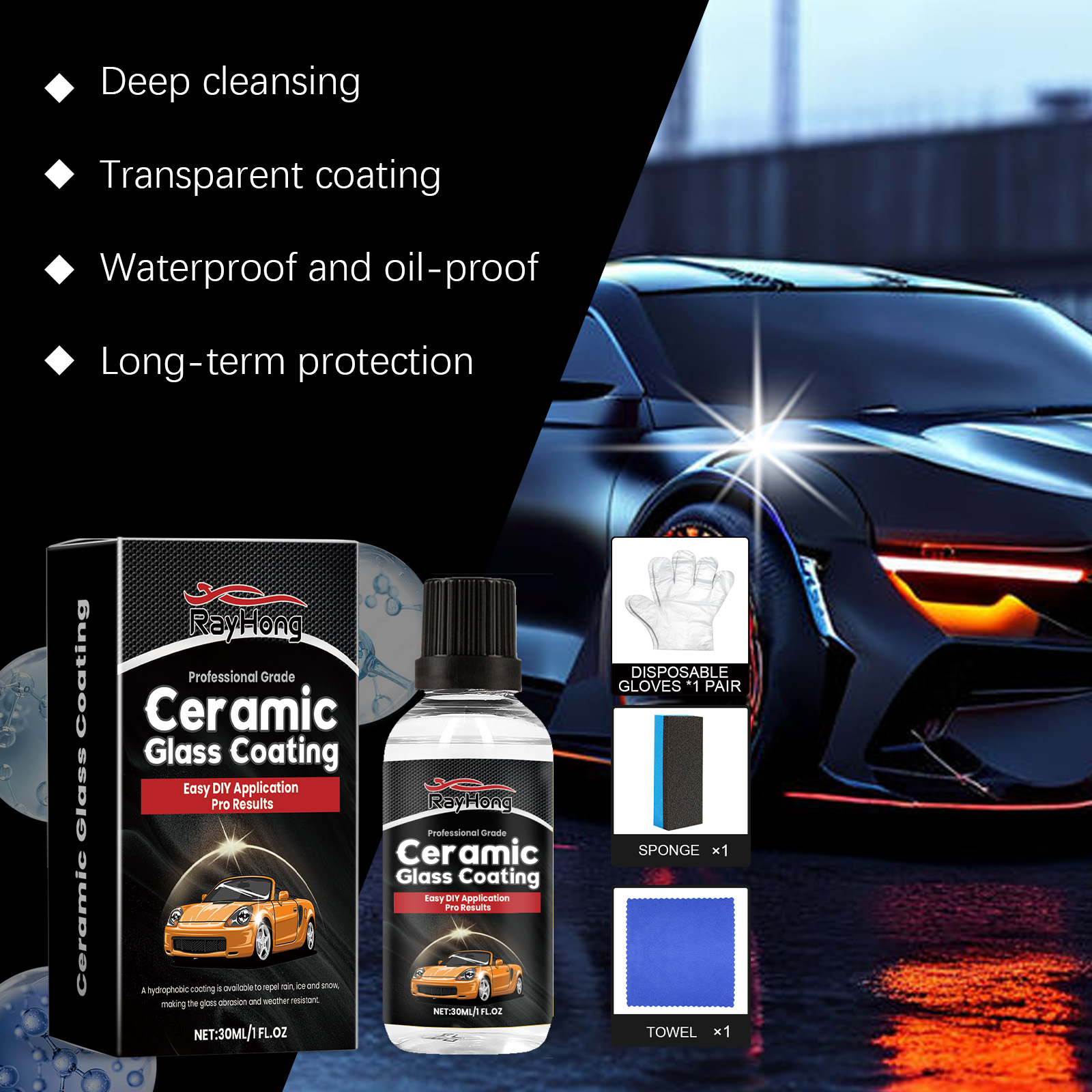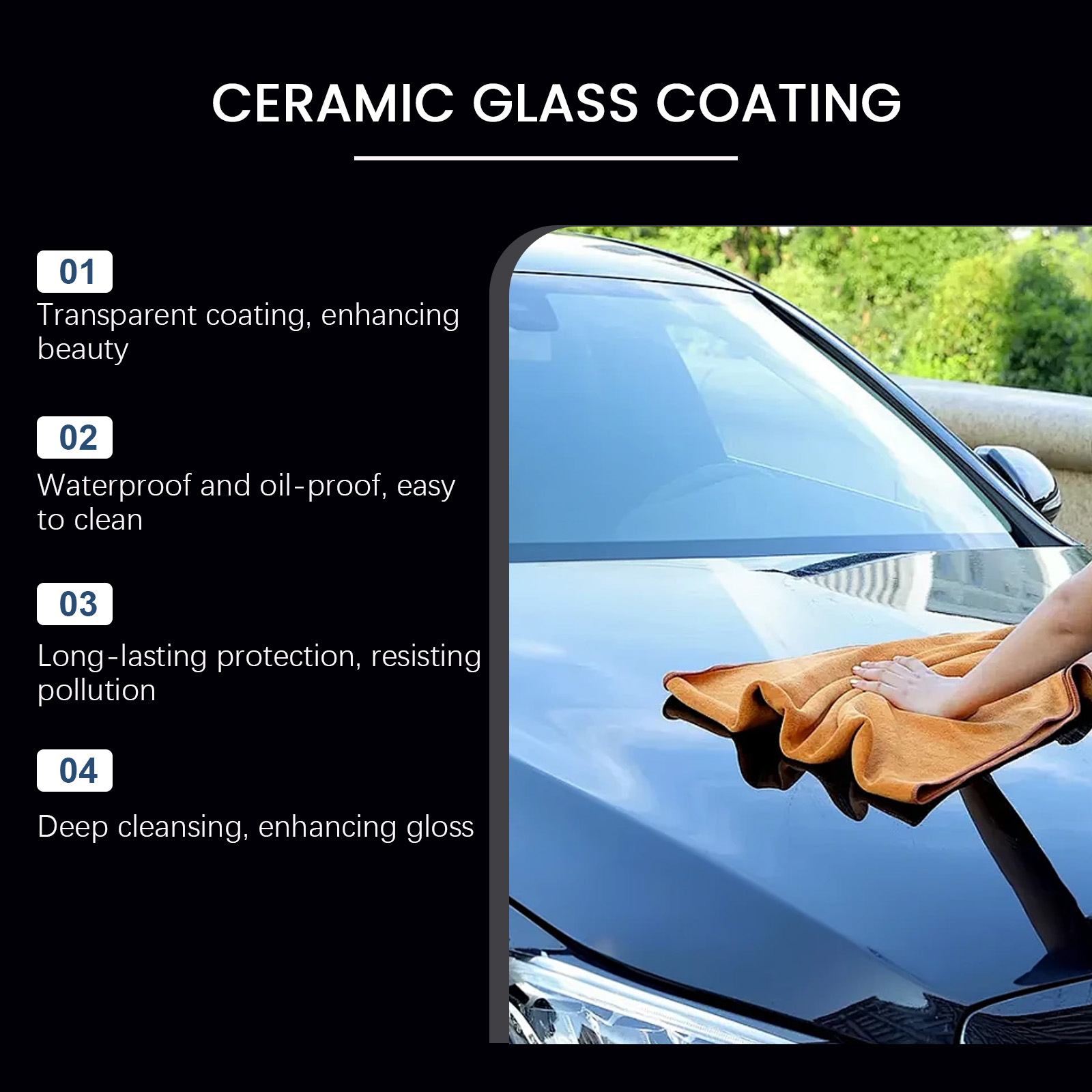 Our ceramic glass coatings contain PE. It can deep clean, improve gloss, reduce stain residue. Its use method is very simple: before use should wear disposable gloves, keep the surface clean and dry, pour the appropriate amount of this product on the sponge, wipe back and forth on the required surface, and finally, wipe off the residue with a towel. And can be durable protection, anti-pollution.
