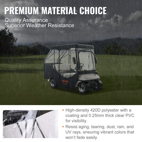 VEVOR Golf Cart Enclosure, 420D Polyester Driving Enclosure with 4-Sided Transparent Windows, 4 Passenger Club Car Covers Universal Fits for Most Brand Carts, Sunproof and Dustproof Outdoor Cart CoverUniversal SizePremium MaterialEnhanced SafetySmooth UsageEasy to InstallBonus AccessoriesDoor Height: 1400 mm / 55.12 inches,Color: Black,Item Model Number: COV-23,Roof Dimensions: 1520 x 1100 mm / 59.84x43.3 inches,Net Weight: 4.57 kg / 10.07 lbs (including all accessories),Side Length: 2480 mm / 97.64 inches,Main Material: High-density 420D Polyester,Transparent Section Material: Transparent PVC