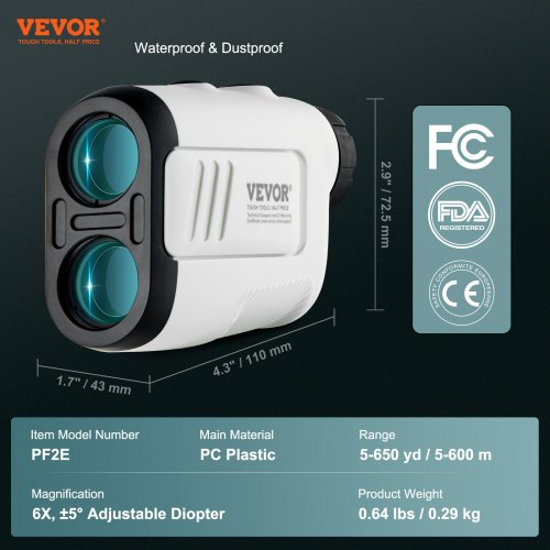 VEVOR Golf Rangefinder, 650 Yards Laser Golfing Hunting Range Finder, 6X Magnification Distance Measuring, Golfing Accessory with High-Precision Flag Lock, Slope Switch, Continuous Scan, and BatteriesHighly Accurate MeasurementIntelligent Slope AdjustmentEnhanced Optical ClarityReplaceable AAA BatteriesFull AccessoriesWide ApplicationItem Model Number: PF2E,Product Weight: 0.64 lbs / 0.29 kg,Material: PC Plastic,Range: 5-650 yd / 5-600 m,Magnification: 6X, ±5° Adjustable Diopter