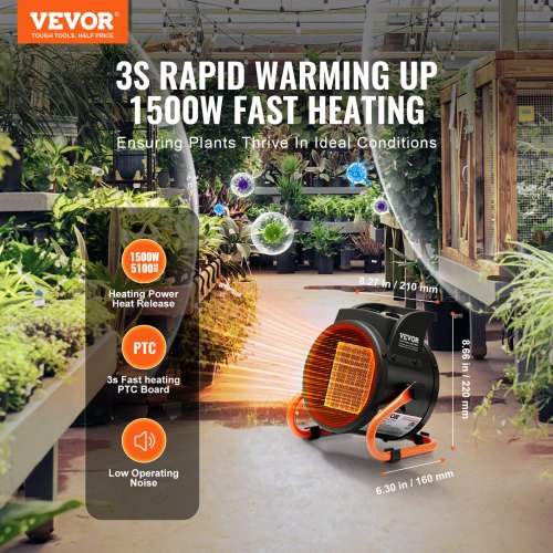 VEVOR Greenhouse Heater, 1500W PTC Fast Heating with Overheat Protection, 3-Speed Setting Small Grow Tent Heater, Electric Portable Heater Fan for Green House, Flower Room, WorkplaceSuitable for Small & Medium SpacesSafety ProtectionCooling and Heating ModesThoughtful DetailsEasy OperationHigh Power HeaterFan Power: 22W,Air Volume: 198 m³/h,Color: Black,High-End Power: 1500W/5100BTU,Model: BGP1506-150,Air Outlet: 6.5 inch / 165 mm,Overheat Protection: Yes,Net Weight: 3.57 lbs / 1.62 kg,Gear: 3rd Gear (Cold Air/800W Heating/1500W Heating),Main Material: Cold Rolled Plate + High Hardness Alloy Steel,Certification: ETL,Product Size: 8.27 x 6.30 x 8.66 inches / 210 x 160 x 220 mm