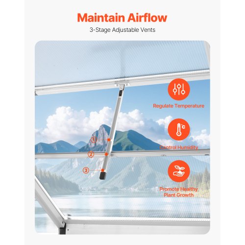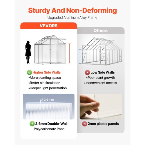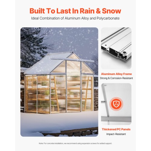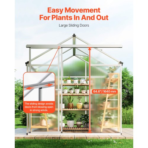 Polycarbonate Greenhouse 6 x 4 Ft Outdoor Walk-in Greenhouse for GardenProtect Plant GrowthImpact ResistanceReduce Harmful RaysMaintain Air CirculationMulti-functional ApplicationWaterproof DesignPackage B: 6 kg / 13.23 lbs,Door Style: Sliding Door (Size: 627 x 1640 mm / 24.7 x 64.6 in),Note: The aluminum frame and PC panels are shipped in separate packages.,Item Model Number: SNG190-2,Product Weight:,Roof Vent: One Side, Adjustable in 3 Settings,Stabilizing Footings: Iron Stakes + Anchoring Accessories,Package A: 12.5 kg / 27.56 lbs,Product Dimensions: 6.06 x 4.13 x 6.33 ft / 184 x 126 x 193 cm,Main Material: PC, Aluminum