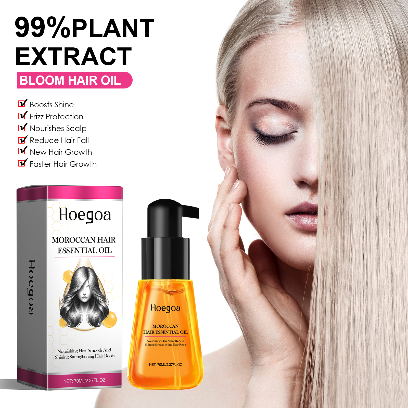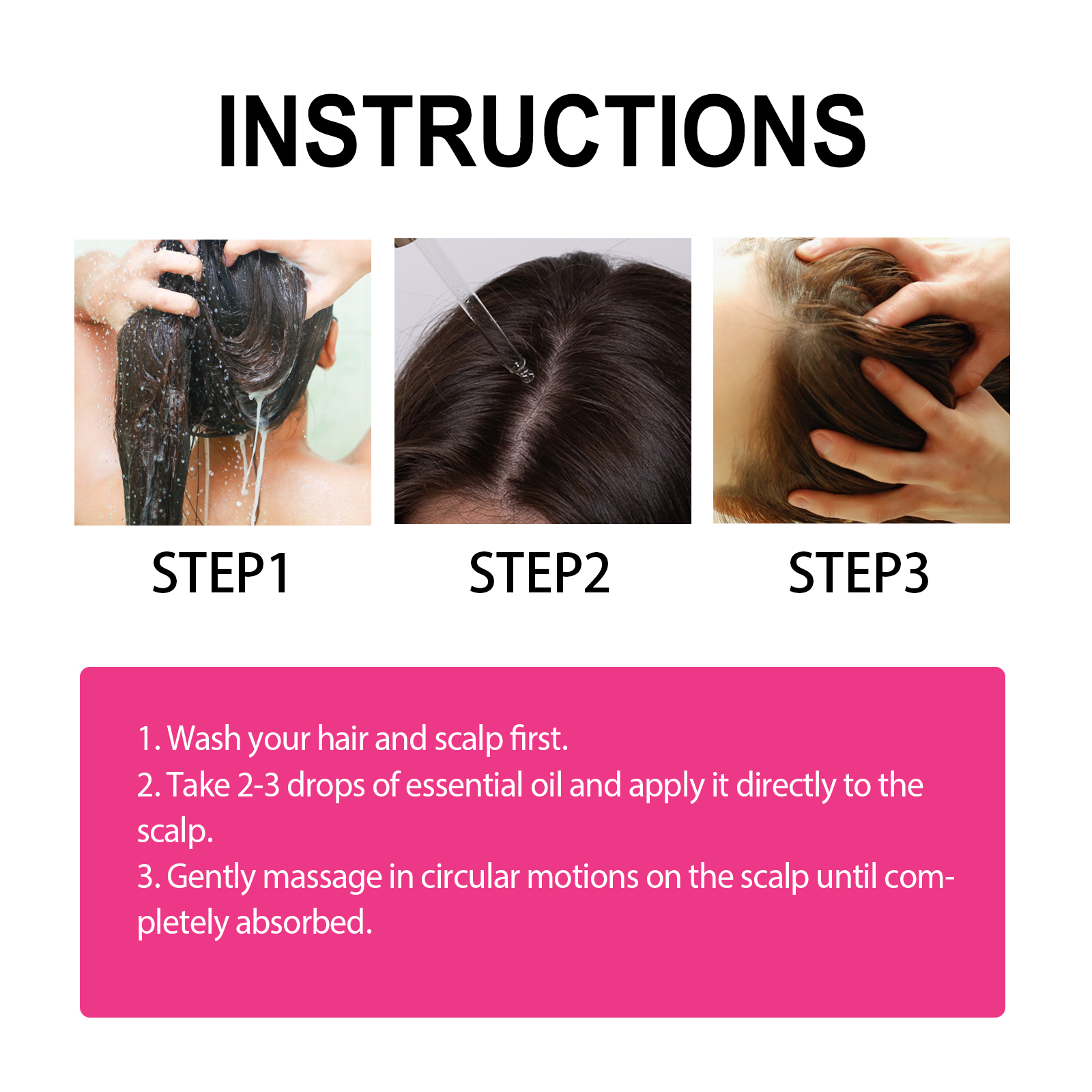 Our Moroccan Hair Essential Oil contain Argania Spinosa Kernel Oil, Panax Ginseng Root Extract, Angelica Archangelica Root Extract. It nourishes and protects hair, improves the health of hair follicles, promotes hair growth, strengthens hair roots, and effectively reduces hair loss and split ends. Its use method is very simple: wash the hair and scalp, take 2-3 drops of essential oil, directly apply to the scalp, gently massage on the scalp until completely absorbed. It can effectively resist dry, non-elastic hair and provide adequate nutrition for the hair roots.