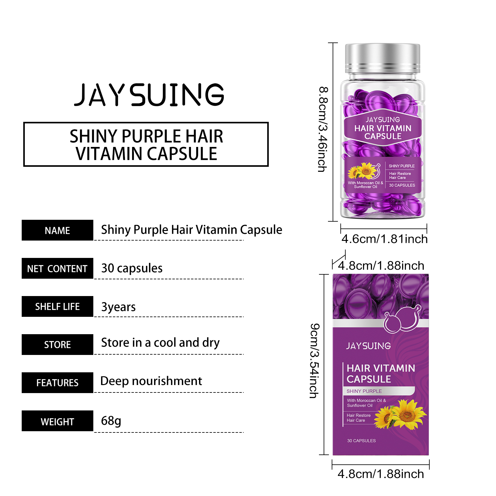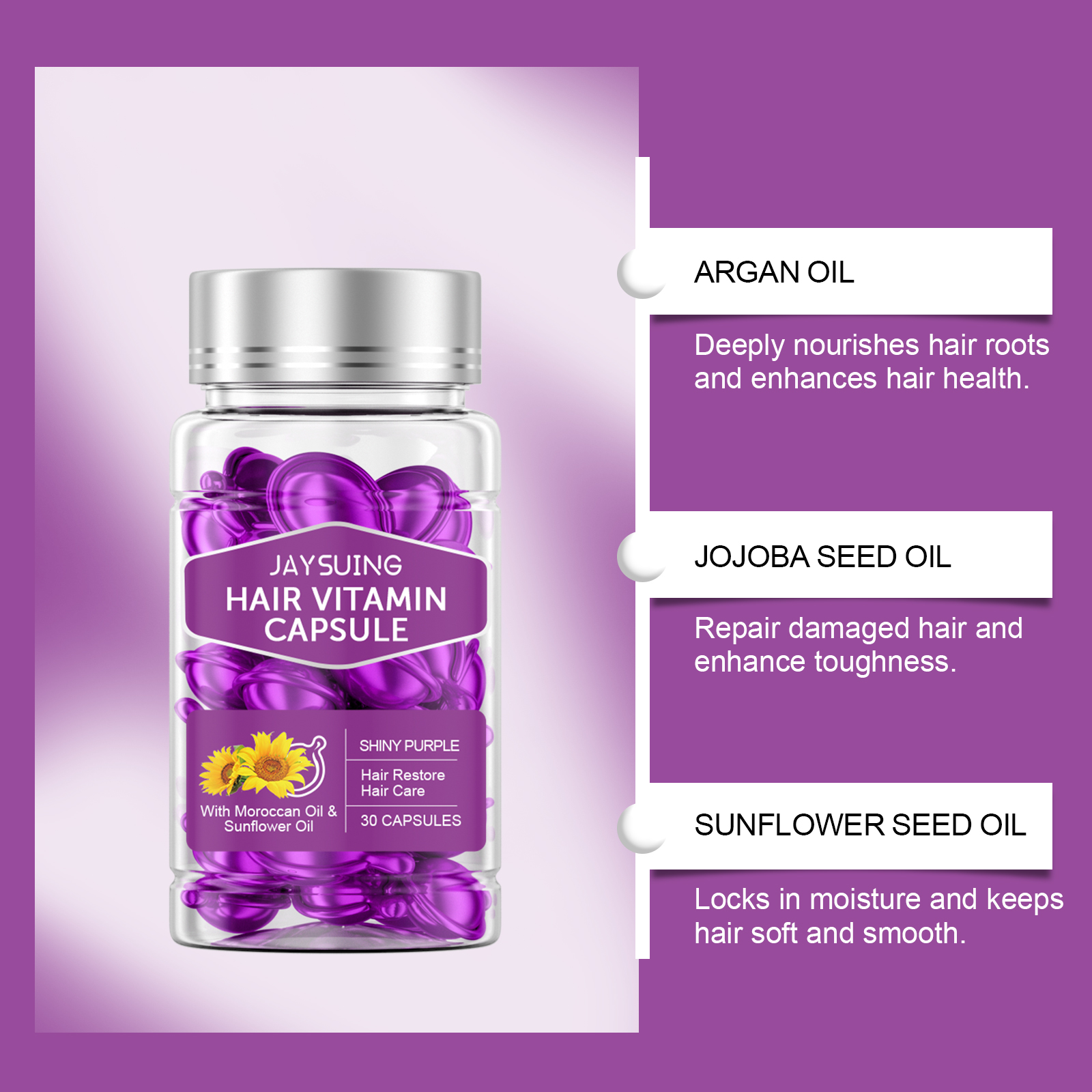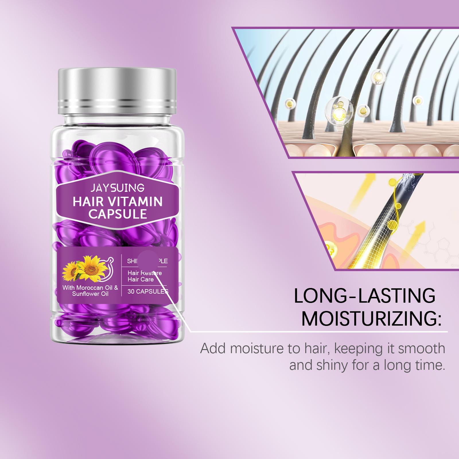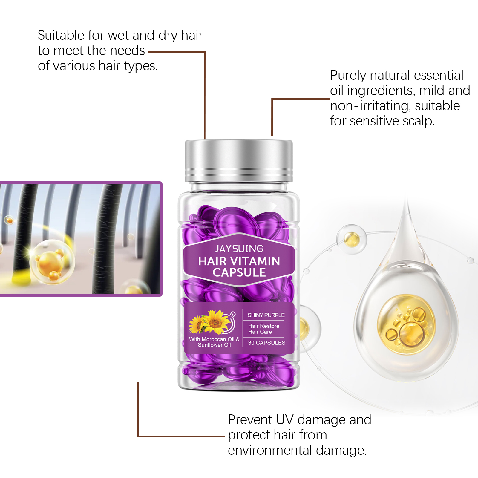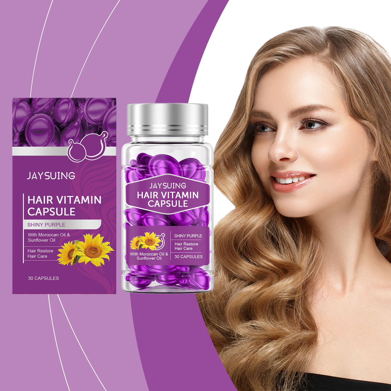 Our Hair Essential Oil Care capsules (purple) contain argan kernel oil and sunflower seed oil. It can deeply nourish hair, repair damaged hair, and enhance hair toughness. The way to use it is simple: 1. Clean your hair and keep it slightly dry. 2. Take a capsule, squeeze it open and apply the essential oil directly to your hair. 3. Gently massage until completely absorbed. Locks in moisture, prevents dryness and frizz, and leaves hair smooth and shiny.