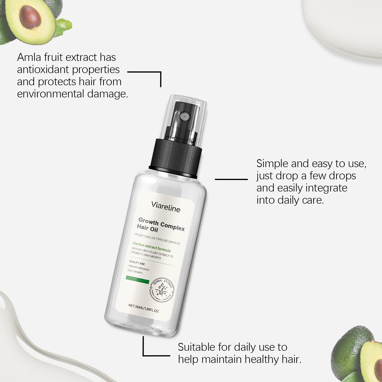 Our herbal hair oil contains avocado oil and ginger root extract. It can effectively penetrate hair and repair dry and damaged hair. Restore hair's natural shine and make it healthy and bright. The way to use it is simple: keep your hair slightly wet after washing. Take the appropriate amount of hair oil, apply it from the middle to the ends of the hair, and massage it into the scalp. Gently massage to soothe scalp and promote hair absorption. And it can not be greasy, and will not make the hair feel heavy after use.