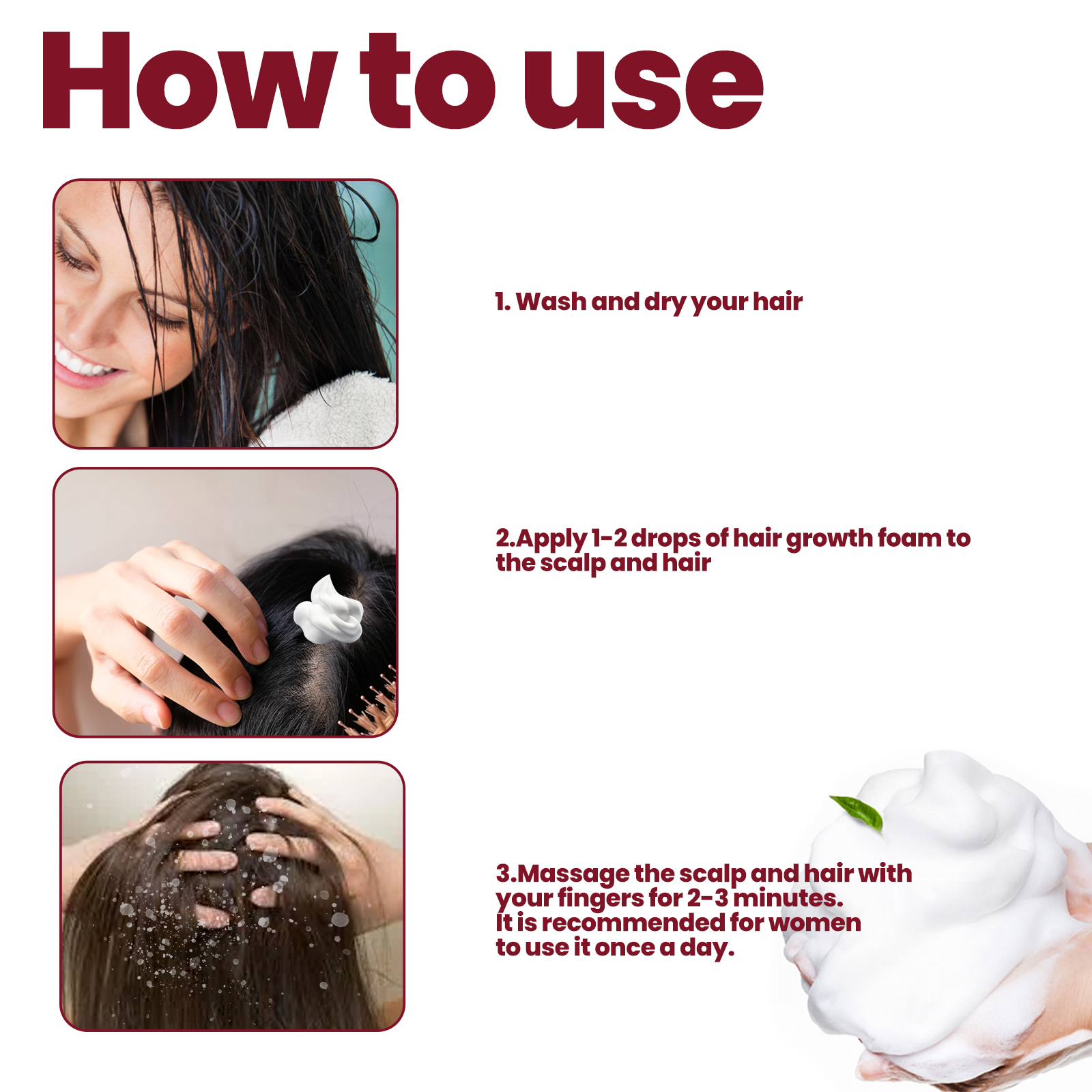 Our hair care foam for women contains biotin, niacinamide and Polygonum multiflorum root extract. It can promote hair growth by activating and stimulating hair follicles. Its use method is very simple: 1. Wash and dry hair; 2. Apply 1-2 coats of hair growth foam to scalp and hair; 3. Massage your scalp and hair with your fingers for 2-3 minutes. It is recommended that women use it once a day. After use, hair darkens and thickens, repairing hair follicles and promoting hair growth.