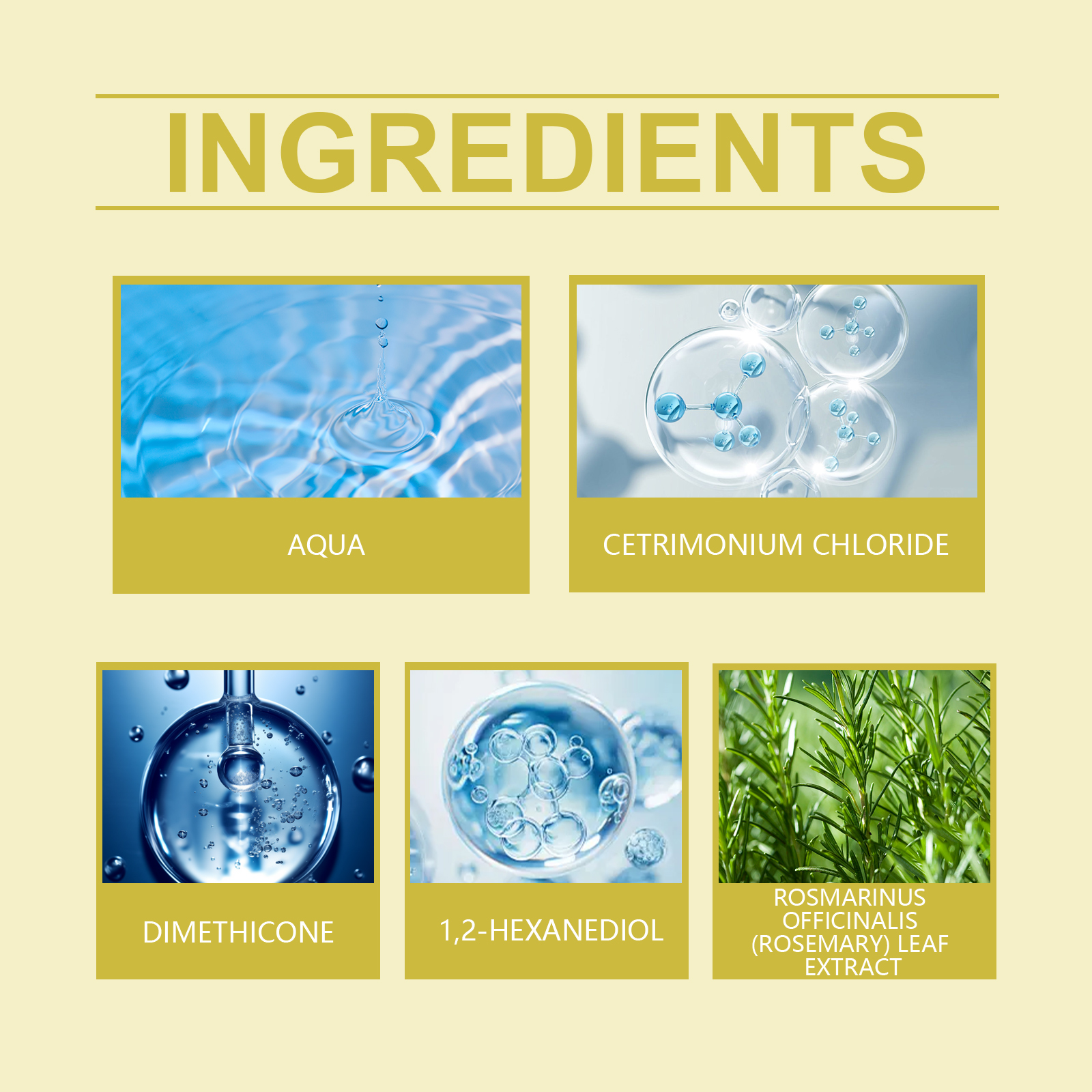Our rosemary conditioner contains 1, 2-hexanediol, rosemary leaf extract. It deeply nourishes hair, making it healthier and more shiny. Ginger oil promotes scalp health and strengthens the vitality of the hair roots. The way to use it is very simple: 1. Wash your hair and dry it until it is semi-dry. 2. Apply appropriate amount to hair and scalp. 3. Gently massage your hair and scalp with your hands. 4. Rinse with water. Coconut oil and Jojoba oil bring natural shine, leaving hair smooth and shiny. Moisturize hair, lock in moisture and prevent dryness.