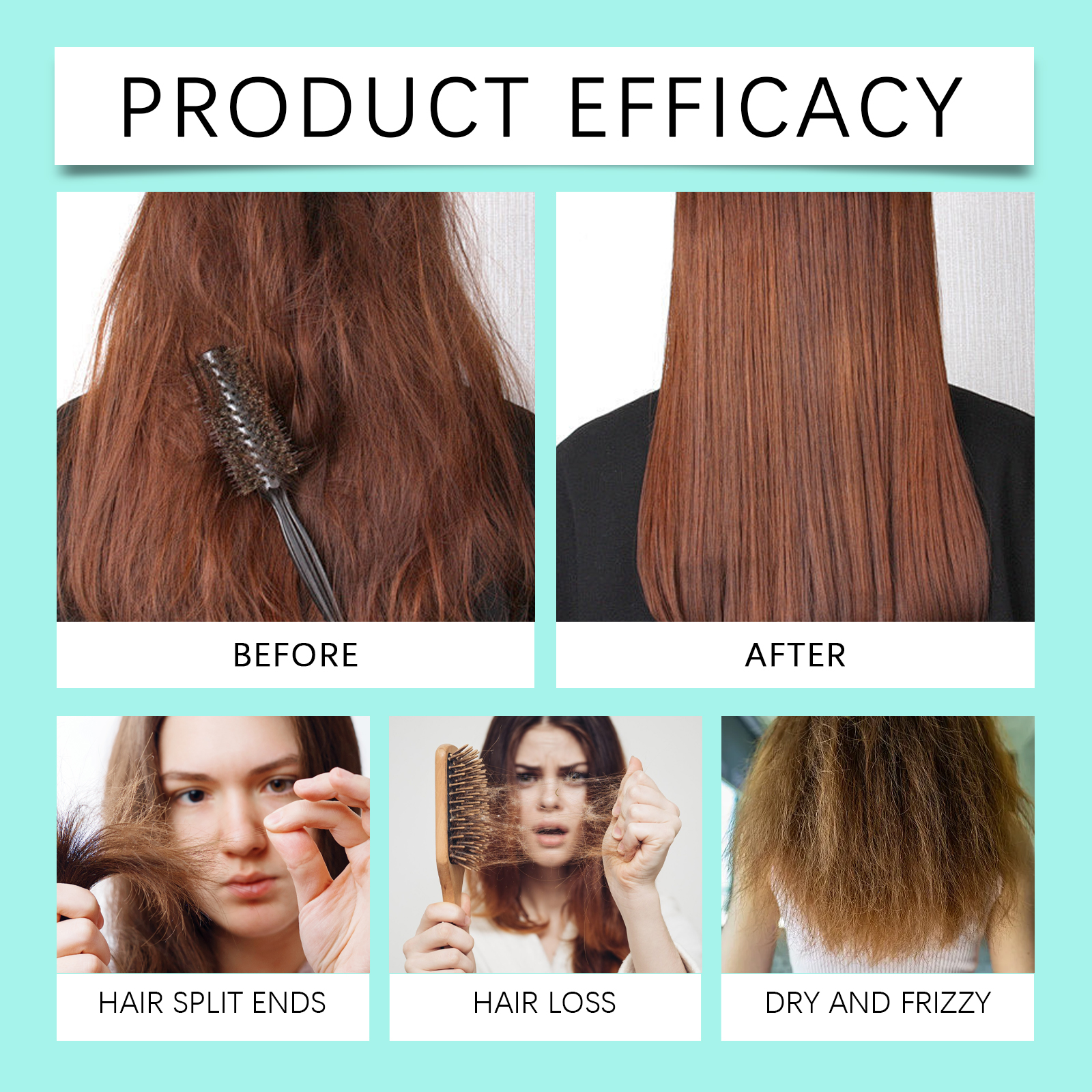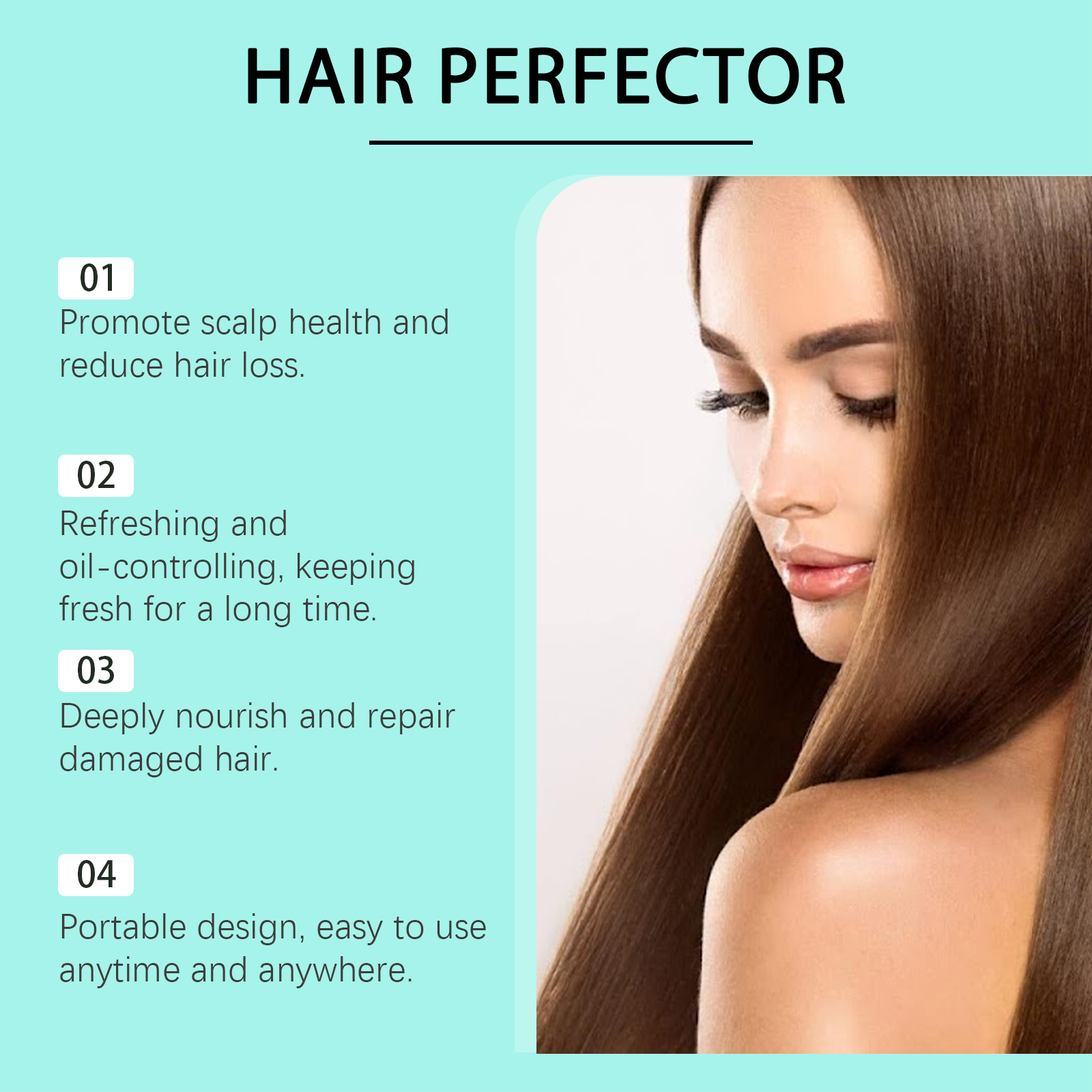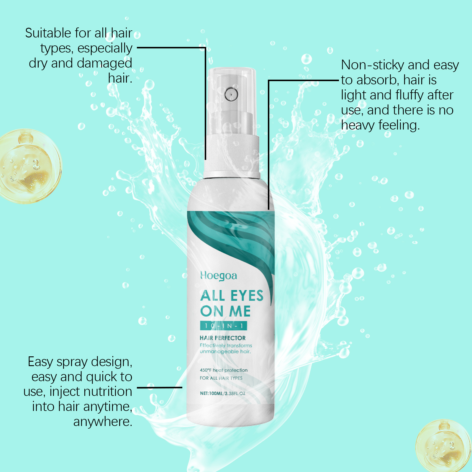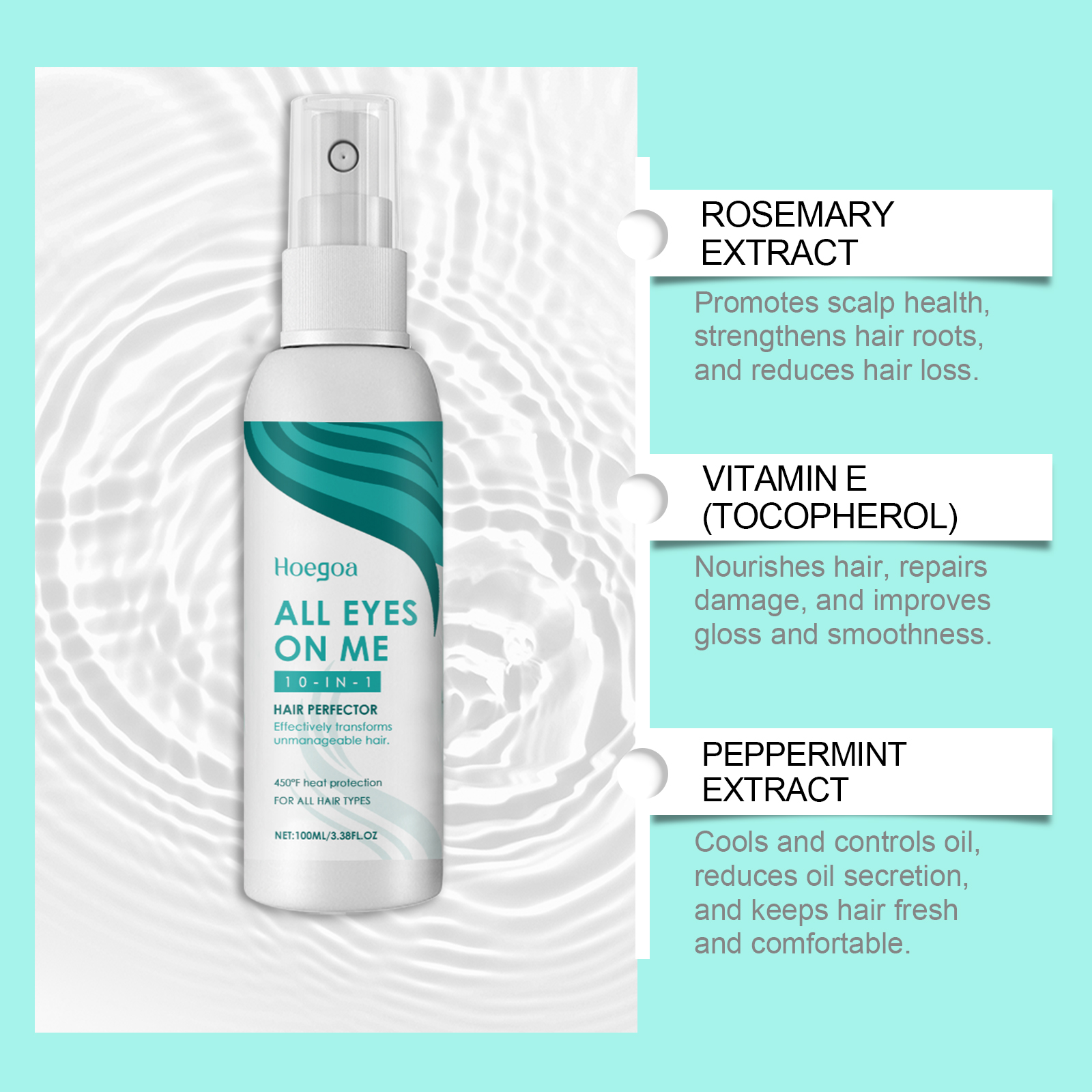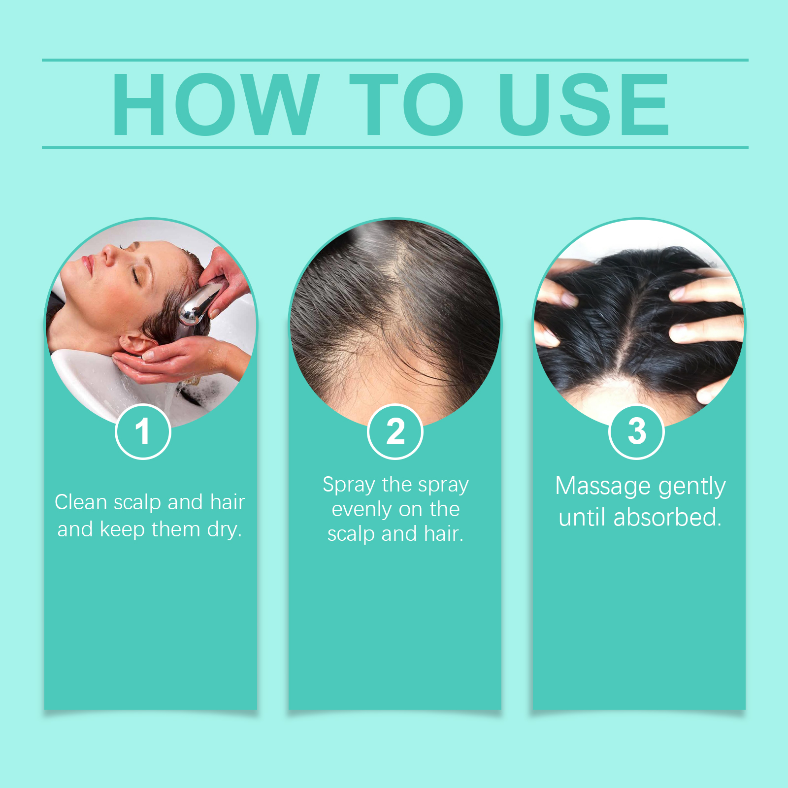 Our hair essence spray contains rosemary extract, Vitamin E(tocopherol), peppermint extract. It can penetrate hair quickly, infusing each hair with long-lasting moisture and keeping it soft and plump. Designed for dry and split hair, effectively reduces split ends and improves hair condition. The way it is applied is simple: clean the scalp and hair and keep them dry. Apply the spray evenly to your scalp and hair. Gently massage until absorbed. And it can make hair smoother and shinier. Non-sticky, easy to absorb, light and fluffy hair without heavy feeling after use.