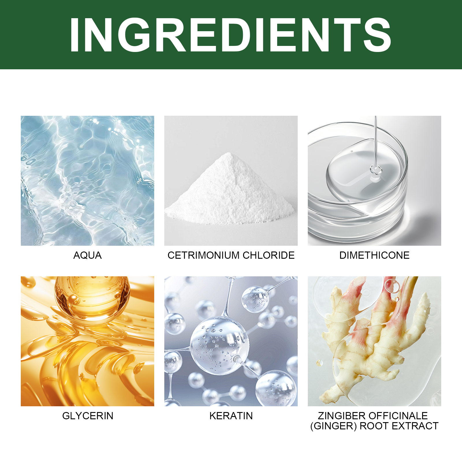 Our ginger conditioner contains glycerin, ginger extract and angelica extract. It can prevent hair loss, promote hair growth, moisturize hair, strengthen hair; Deeply moisturize the scalp, replenish the hair moisture, create a balanced and healthy environment for the scalp, and make the hair glow. Its use method is very simple: 1. After shampooing, dry your hair with a towel until your hair is half dry. 2. Then evenly apply an appropriate amount of conditioner to the ends of your hair, so that the conditioner is evenly distributed, then wear a shower cap, and wait for 5 minutes. 3. Rinse conditioner with warm water at the end. Ginger conditioner can make hair thicker, scalp healthier and dandruff less of a problem. Not only will it boost your confidence, but it will also improve your overall hair experience.