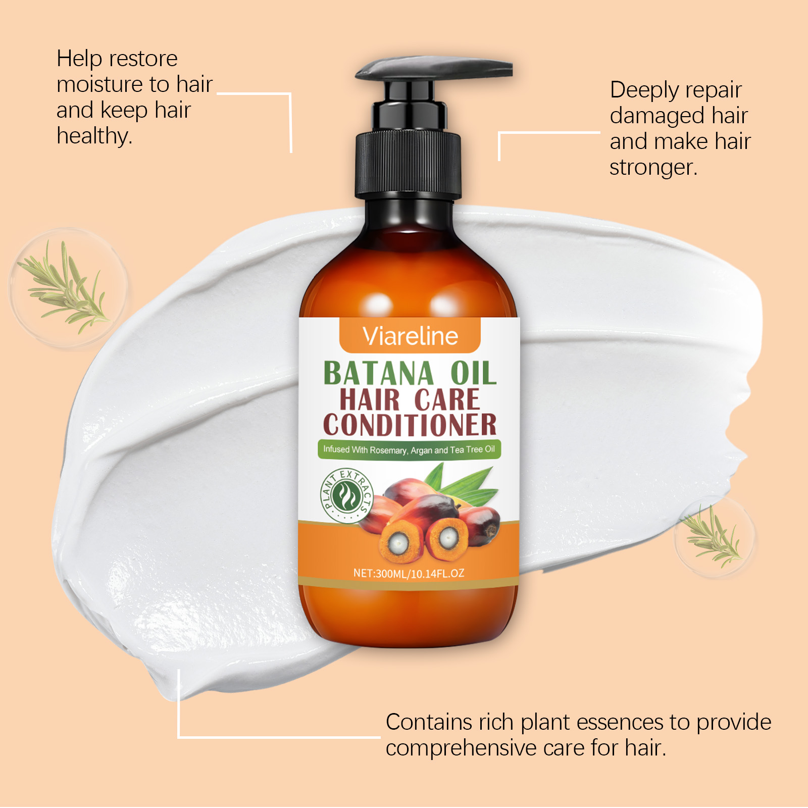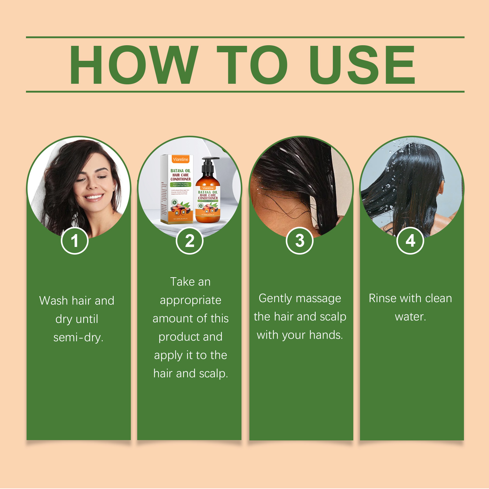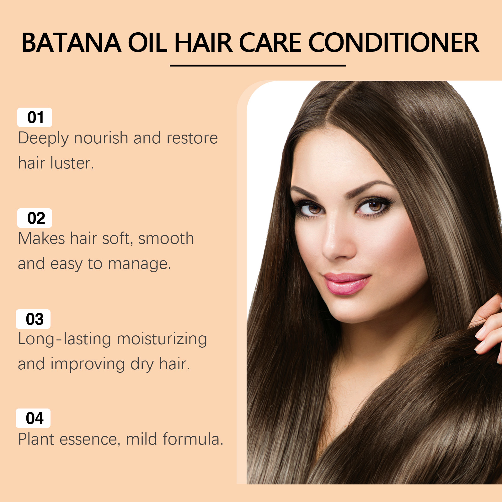 Our Batana oil conditioner contains polyquaternium-7, polydimethylsiloxane. It provides lasting moisture to every strand of hair from root to tip giving it a natural shine and shine. The way to use it is simple: wash your hair and blow dry it until it is semi-dry. Apply appropriate amount of this product to hair and scalp, gently massage hair and scalp with your hands. Rinse with water. And can make dry and frizzy hair soft and smooth.