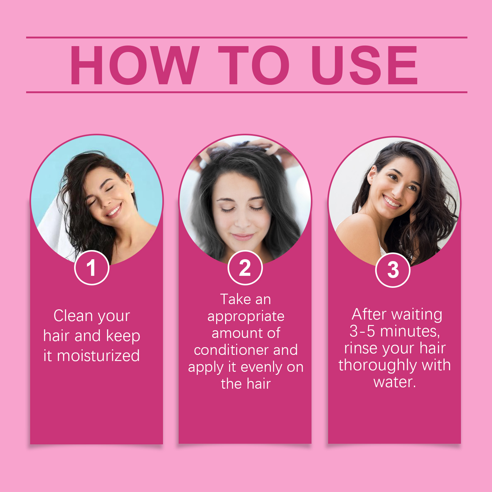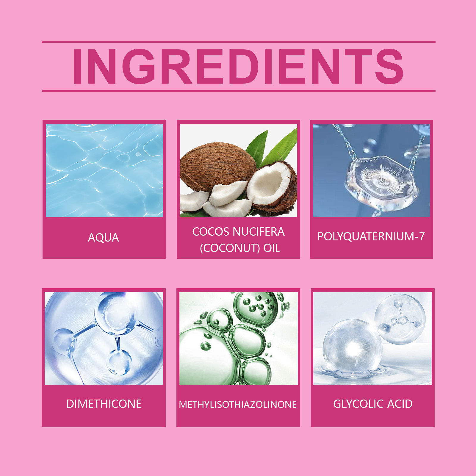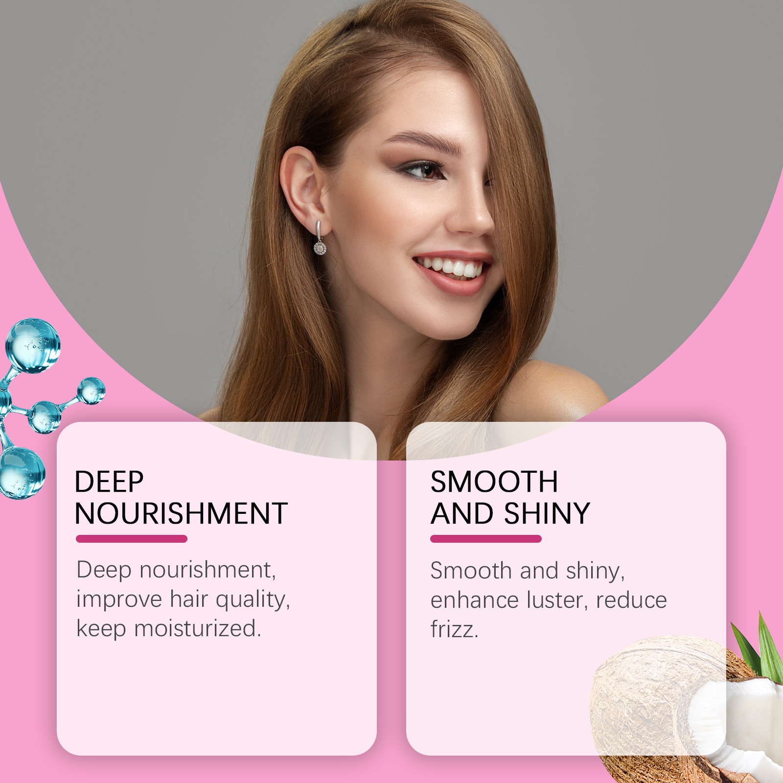 Our glossy and nourishing conditioner contains coconut oil, polyquaternium-7. It deeply nourishes, improves hair quality and keeps it moisturized. Smooth and shiny, increase shine, reduce frizz. Its use method is very simple: clean hair to keep moisturized take the right amount of conditioner, evenly apply to the hair, wait 3-5 minutes, rinse the hair thoroughly with water. And can moisturize and repair, reduce damage, improve comfort.